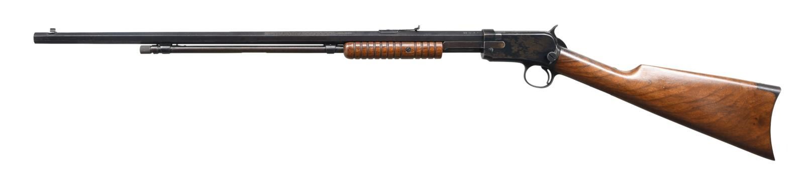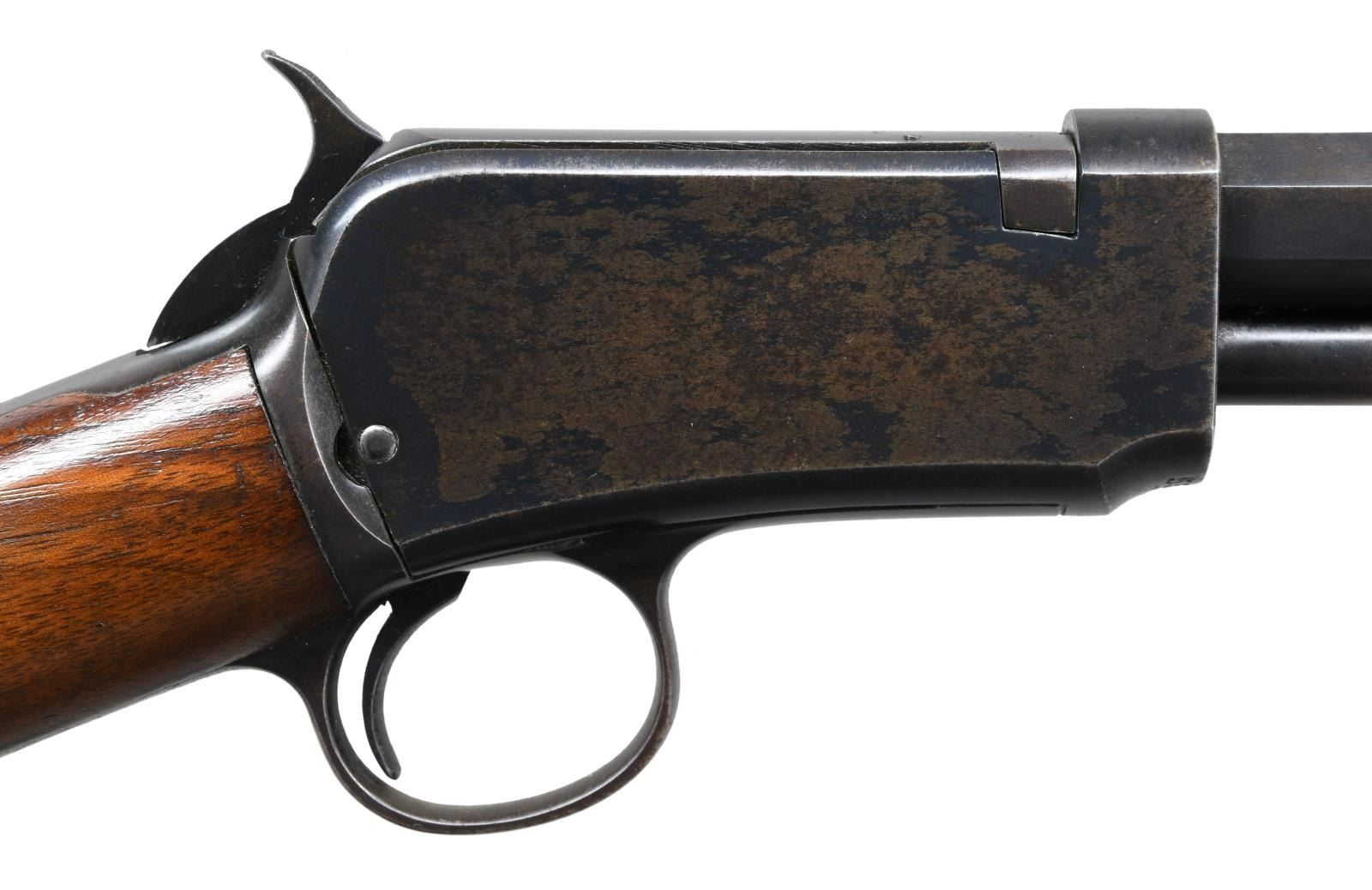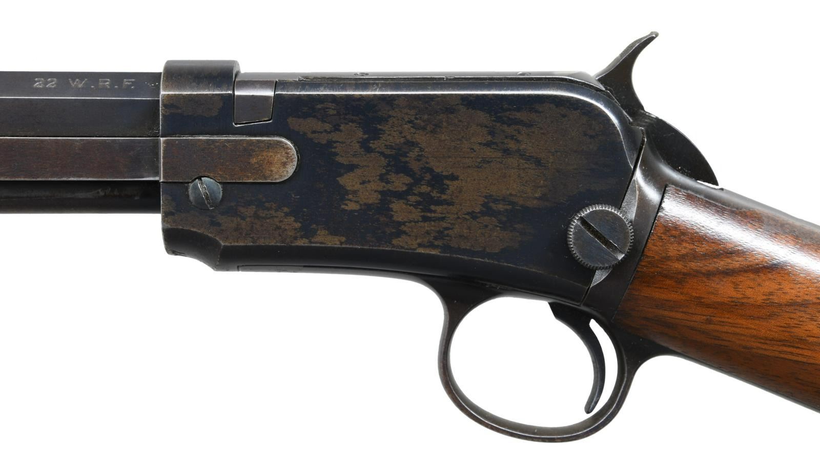 Cal. 22 WRF. S# 557207A. Bbl. 24" octagon. 3rd Model Mfg. 1914. Fixed factory front & elevation adjustable rear sights. Takedown w/ matching S# on lower tang & Bbl. assembly. Blued finish w/ 12 groove forend & straight grip smooth buttstock w/ metal crescent buttplate. CONDITION: metal retains about 70% blue w/ heavy flaking on the frame & light older rust throughout. Stock set has an added coat of varnish over a few scattered dings & dents. Bore is good, fairly bright w/ solid rifling & light scattered pitting. PROVENANCE: From the Estate of Jon Thomas. (23-1658/CW). CURIO. $500-700