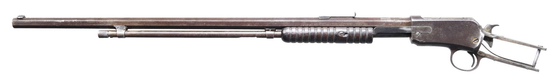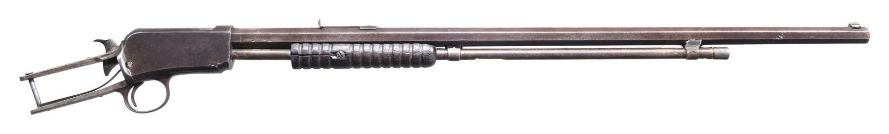Cal. 22 Short. S# 72388. Bbl. 24" octagon shortened to 23 3/8". Front sight has broken blade. Rear sight is missing elevation screw. Mag. tube is shortened to 17 1/4". Inside of mag. tube is shortened accordingly. Front mag. band is soldered to the bbl. Retainer pin in 2nd mag. band is removed. Second Model action with mortised breech bolt. Takedown screw is an inappropriate replacement. Extractor screws are missing from bolt with inappropriate pinned replacements. Small rnd. wood forearm. Stock and buttplate are not present. Mfg. in 1899. CONDITION: metal has gray appearance with light pitting. Breech end of bbl. and receiver have wrench marks. Forearm has age darkened appearance showing chips and cracks. Dark pitted bore has partially visible rifling. (25-3103/DS). CURIO. $100-200.