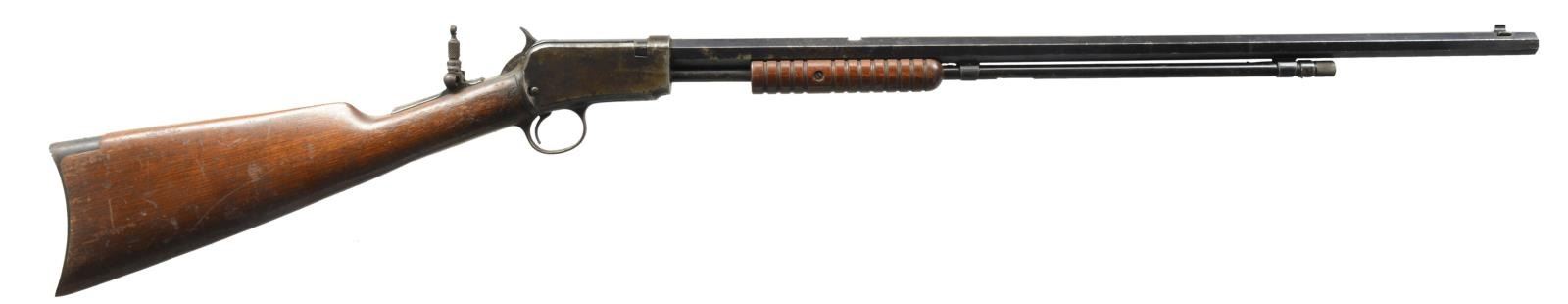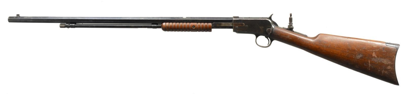 Cal. 22 S. S# 832409. Bbl. 24" oct. w/ bead front sight, open dovetail for rear sight & combination tang sight. Tubular mag. Sm. grooved forearm & straight grip walnut stock w/ crescent steel buttplate. CONDITION: bbl. retains 80% blue showing edge wear & spots of surface corrosion. Action retains a sm. amount of blue flaking to gray showing spots of surface corrosion. Breech bolt retains 90% blue showing spots of corrosion. Wood has lightly worn original finish showing numerous scratches & handling marks buttstock. Buttplate shows surface corrosion. Bright bore w/ strong rifling. (20-2609/DS). CURIO. $400-600.