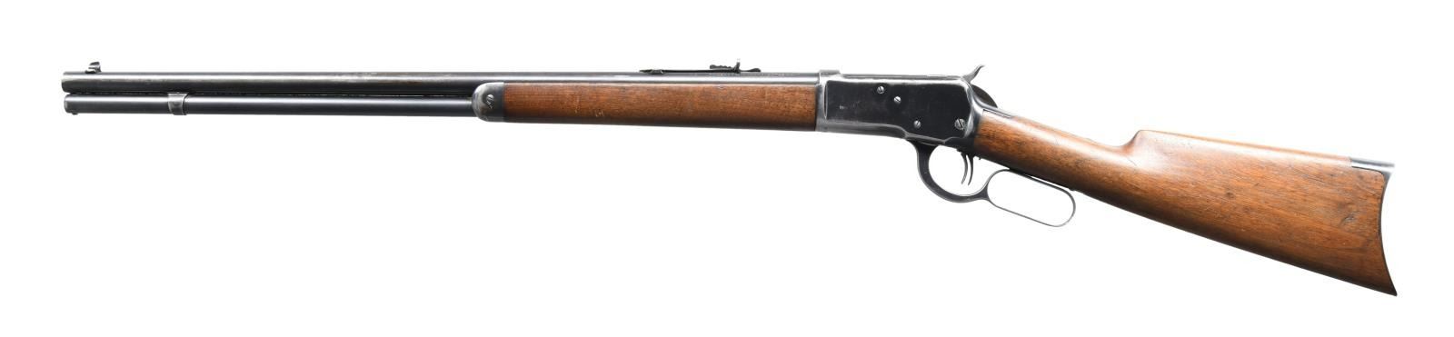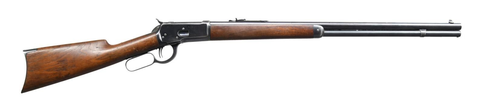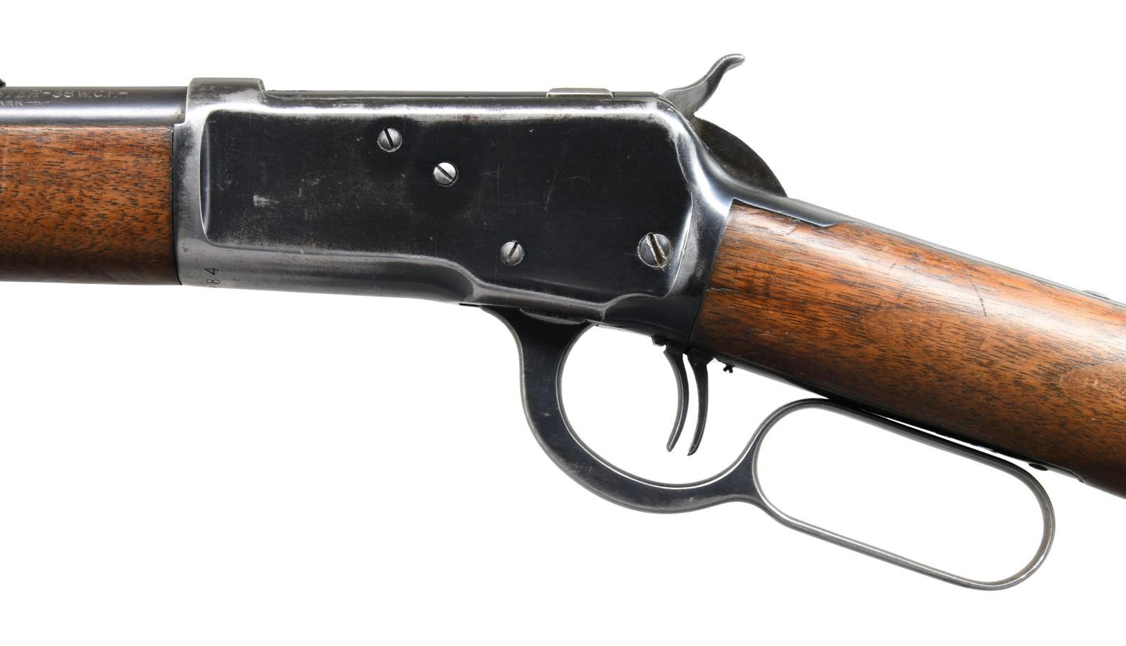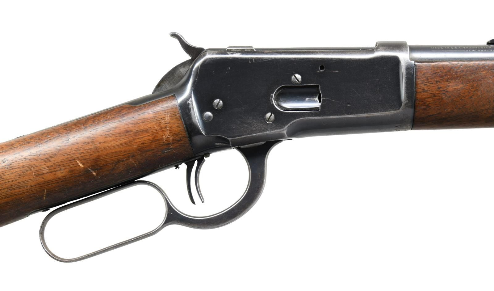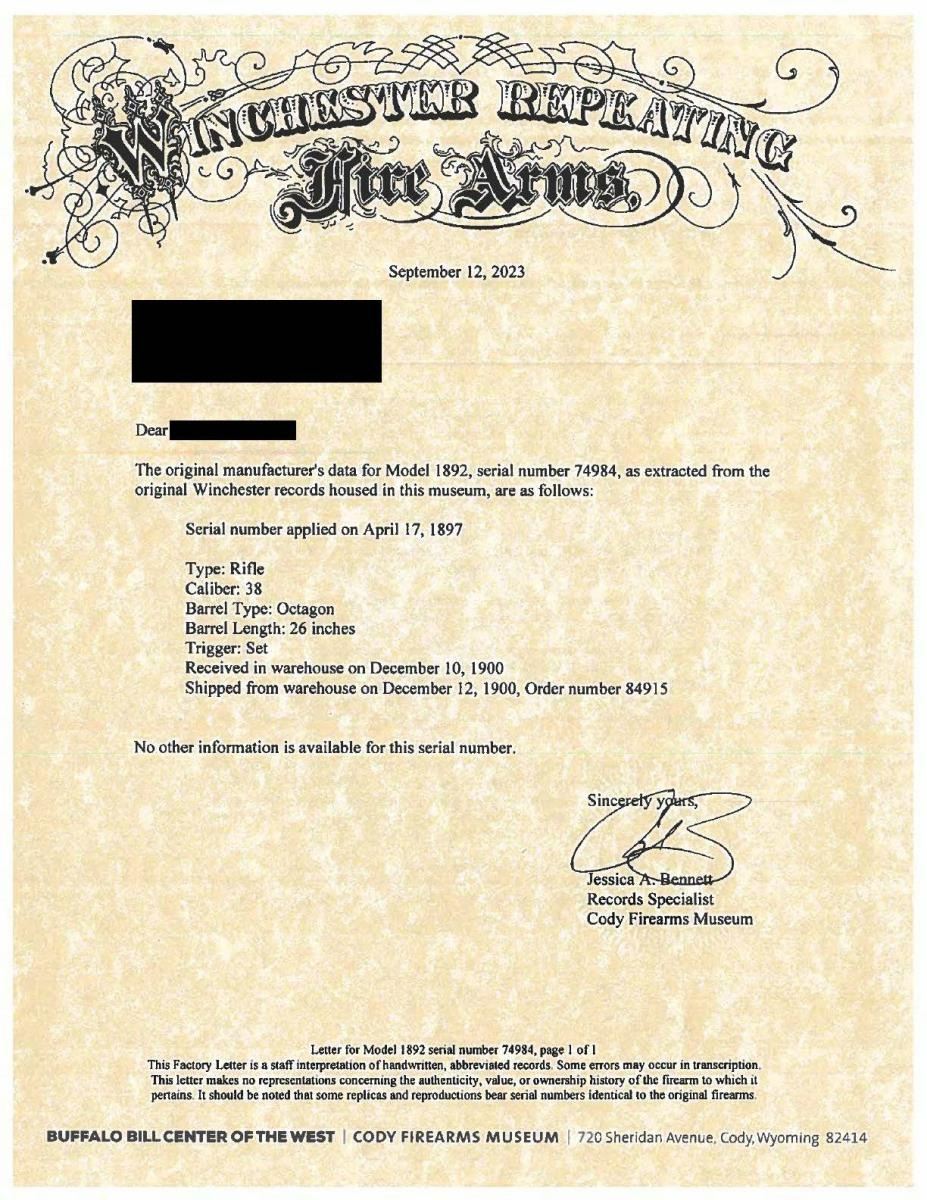Cal. 38 WCF (38-40). S# 74984. Bbl. 24" round (letter states 26" octagon). Original sporting sights. Full mag. Double-set trigger. Walnut forearm & straight grip stock w/ crescent steel buttplate. UNATTACHED ACCESSORIES: Cody Firearms Museum letter stating the following information: "Serial number applied on April 17, 1897 / Type: Rifle / Caliber: 38 / Barrel Type: Octagon / Barrel Length: 26 inches / Trigger: Set / Received in warehouse on December 10, 1900 / Shipped from warehouse on December 12, 1900 / Order number 84915." CONDITION: bbl. and mag. tube retains 80% of their lightly worn blue, showing handling wear & spots of freckling. Action has a 70% reblued finish, showing carry wear. Hammer will not hold in a safe position, and triggers will not set properly. Wood has a worn finish w/ numerous dents & marks. Left side of the stock has a small crack extending from the action. Generally bright bore, retaining lightly worn rifling. (01-24569/DS). ANTIQUE. $700-1,000.