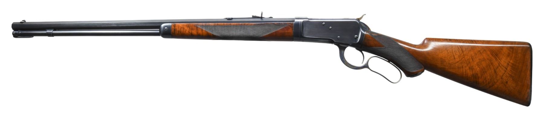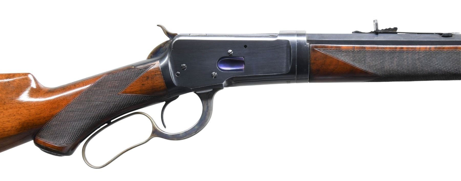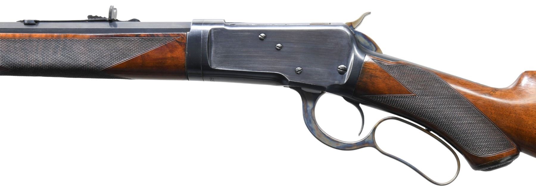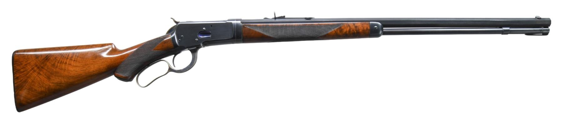 ACTION RIFLE. Cal. 25-20. S# 187179. Bbl. 24" octagon. Proper sporting front and rear sights. Full length mag. Takedown action with blue and case colored finish. Forearm and hard rubber capped pistol grip stock of fancy walnut with Style H factory checkering and hard rubber shotgun buttplate. Left inside of lower tang is marked with assembly # "16664" followed by wood grade marking "XX" and "S". Top tang channel of stock is unmarked. Mfg. in 1901. CONDITION: metal retains over 98% restored blue and case colored finish showing slight edge wear and fine scratches. Stock and forearm have a good gloss refinish with freshened checkering. Stock has a small repaired crack extending from the left side of the top tang. Sound action. Bore is bright with sound rifling. (25-4957/DS). CURIO. $7,500-12,500.