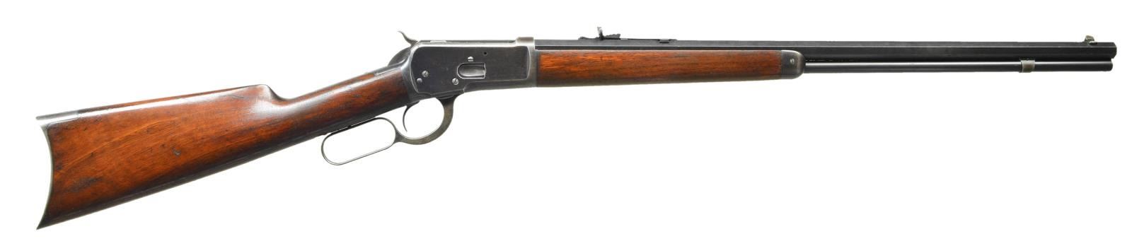 Cal. 32 WCF (32-20). S# 263519. Bbl. 24" octagon with original sporting sights. Full length mag. Blue finish with case colored lever & hammer. Walnut forend & straight grip stock with crescent steel buttplate. Mfg.1904. CONDITION: Over 70% lightly faded original blue showing edge & carry wear. Hammer & lever have nicely visible case colors on sides. Moderately worn original wood finish shows scratches, marks & small dents. Bright bore has strong rifling. PROVENANCE: Estate of Frank Glenn Marsh. (22-3367/DS). CURIO. $1500-2000.