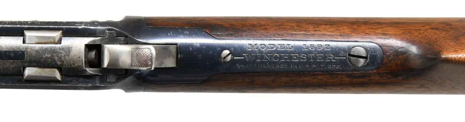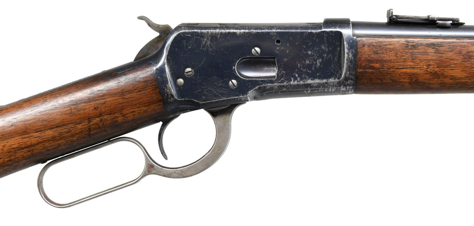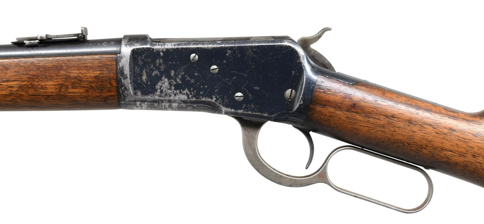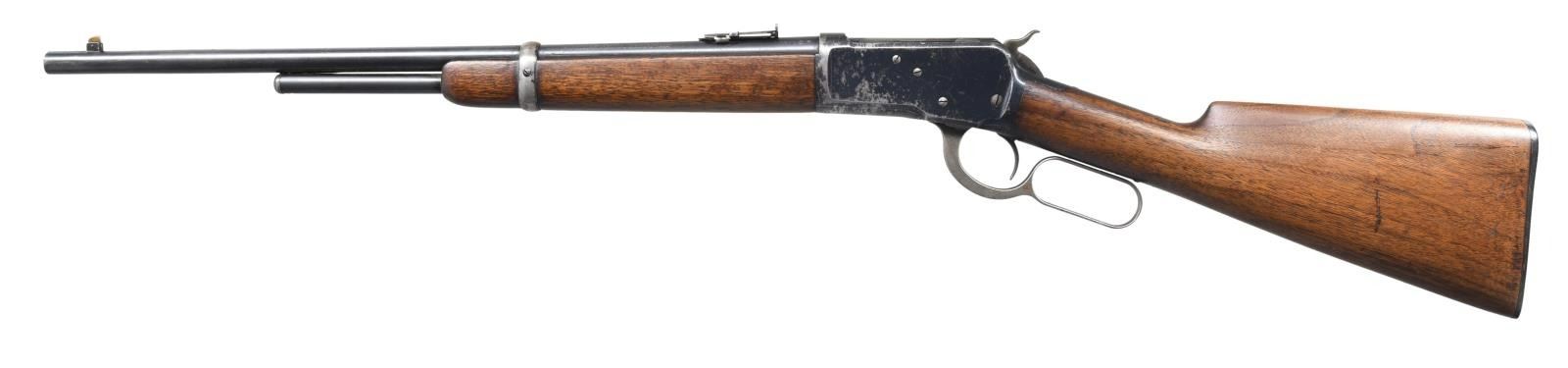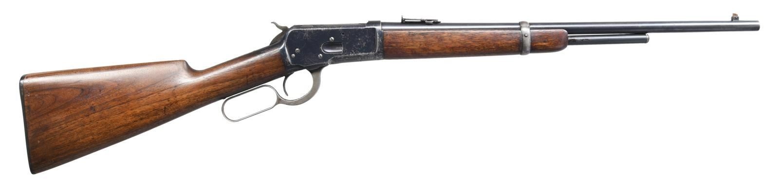 Cal. 32 WCF (32-20). S# 590367. Bbl. 20" carbine style. Replacement pinned brass blade front sight w/ original carbine leaf rear sight. Uncommon 2/3rds length mag. Action has no provision for a saddle ring as normally found on carbines. Blue finish w/ case-colored hammer & lever. Walnut forearm & straight grip stock w/ hard rubber shotgun buttplate. Mfg. 1911. CONDITION: bbl. & mag. tube retain 85% of their lightly worn blue. Action is 70% blue, showing spots of flaking. Wood has a moderately worn finish, showing scattered handling marks. The bright bore retains sound rifling. (23-5779/DS). CURIO. $1,000-1,500.
