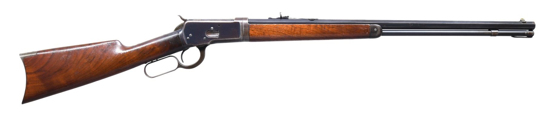 Cal. 32 WCF. S# 286907. Bbl. 24" octagon of takedown style. Sporting sights. Full length mag. Blue finish w/ case colored hammer & lever. Walnut forearm & pistol grip stock w/ crescent steel buttplate. UNATTACHED ACCESORIES: Cody Firearms Museum Show Search Form listing the following information. SN applied: Feb. 7, 1905 / Date In: March 8, 1905 / Rifle / Caliber: 32 / Bbl. Shape / Oct / Other Features: TD / Trigger: Plain / Date Shipped: May 19, 1905 / Order #: 11311. CONDITION: 80% bbl. & mag. blue showing edge wear. Action has 70% lightly faded blue showing edge wear. Hammer & lever show some dark case colors. Stock & forearm have added varnish over scattered light scratches & marks. Toeline of stock has an open hole & chip from sling eye attachment. Forearm has a small chip at left side of forearm cap. Sound action. Bore has darkened appearance w/ worn rifling. (25-741/DS). CURIO. $2,250-3,000.