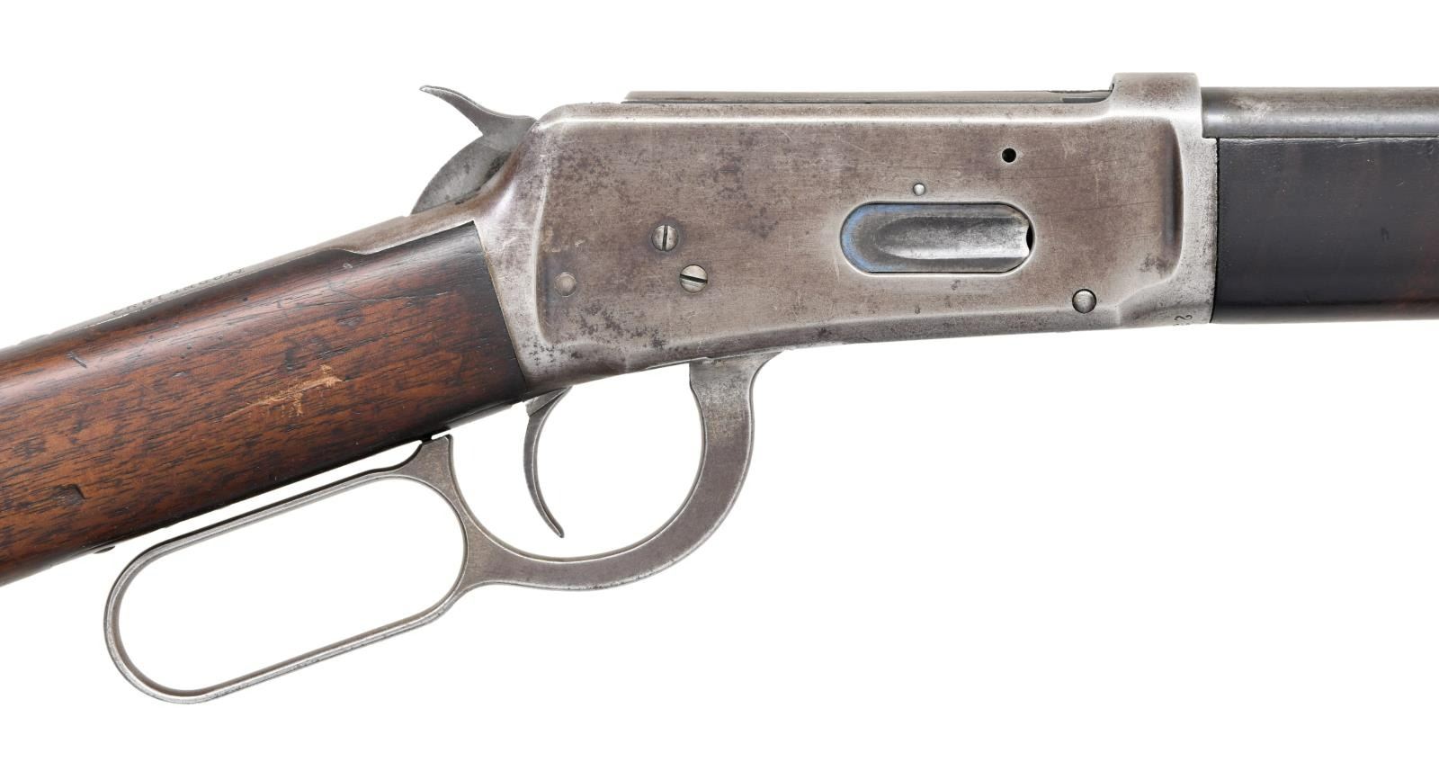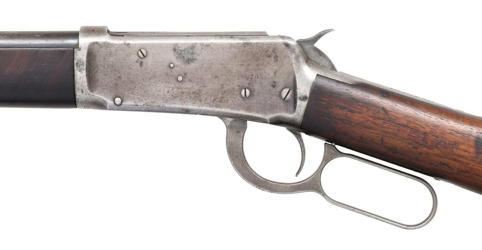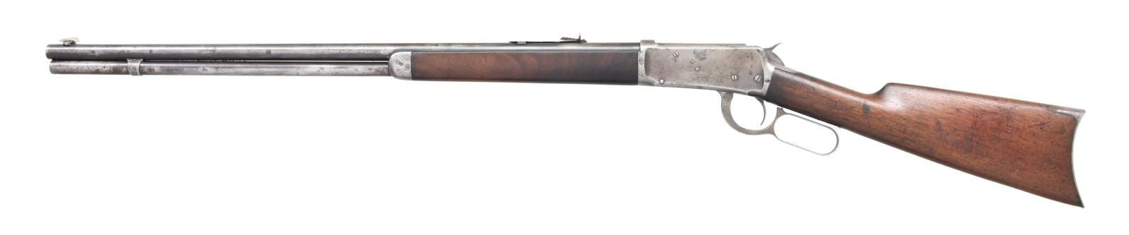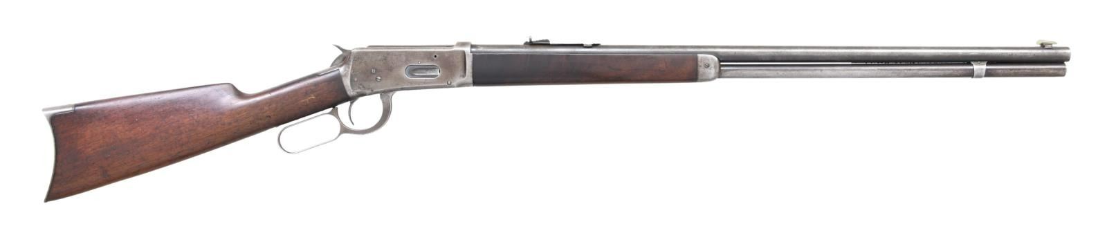 Cal. 30 WCF. S# 23107. Bbl. 26" round. German silver blade rocky mountain front sight w/ sporting rear sight having a replacement elevator. Full length mag. Walnut forearm & straight grip stock w/ crescent steel buttplate. Mfg. 1895. CONDITION: 20% fading bbl. blue w/ balance of bbl., mag. tube & action having faded gray appearance showing areas of cleaning & scattered spots of light pitting. Wood shows heavy wear w/ scratches, dents & handling marks. Stock has cracks on both sides extended from the action. Bore has darkened appearance & retains sound rifling. (01-24295/DS). ANTIQUE. $1,000-1,500.