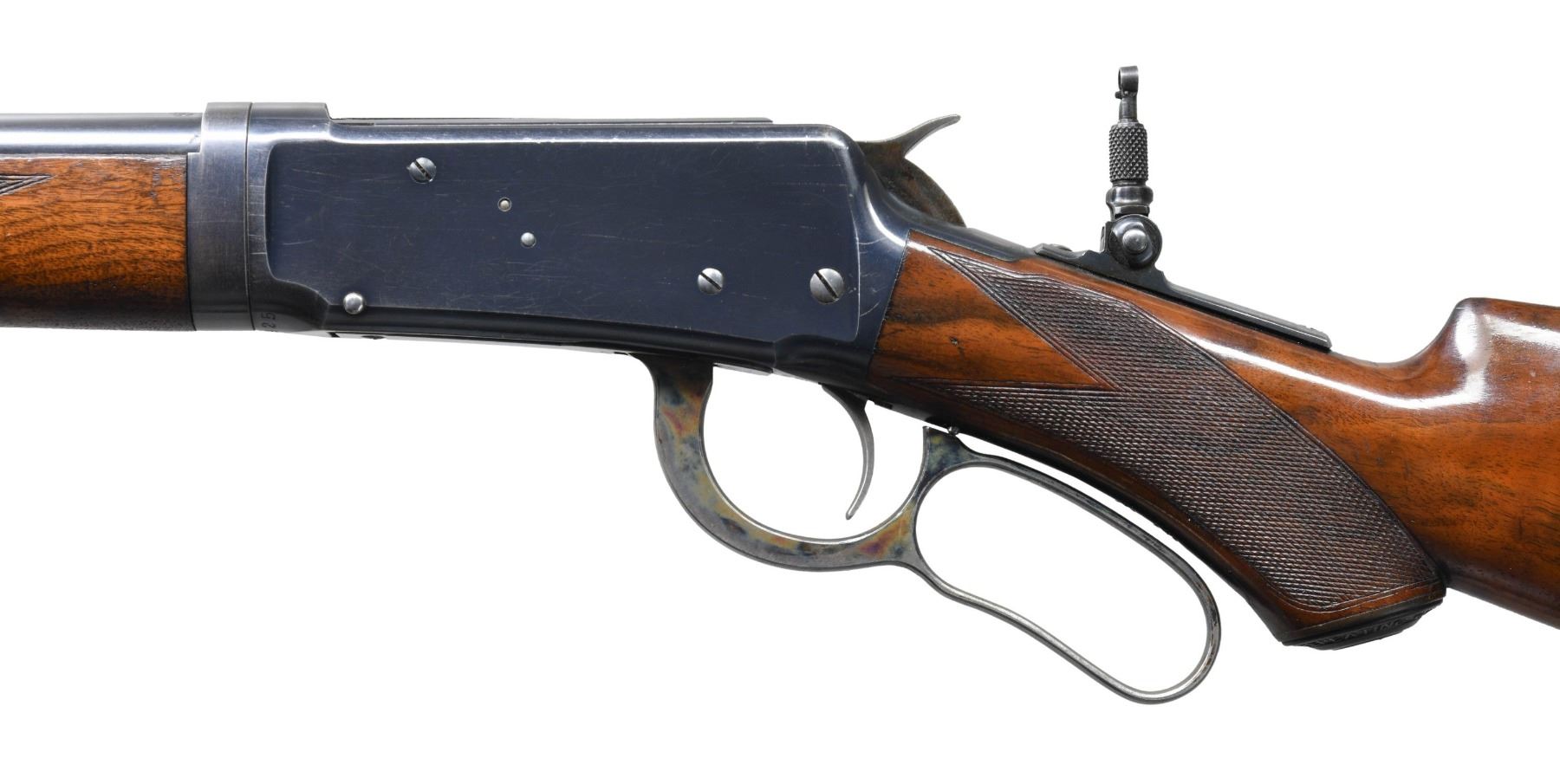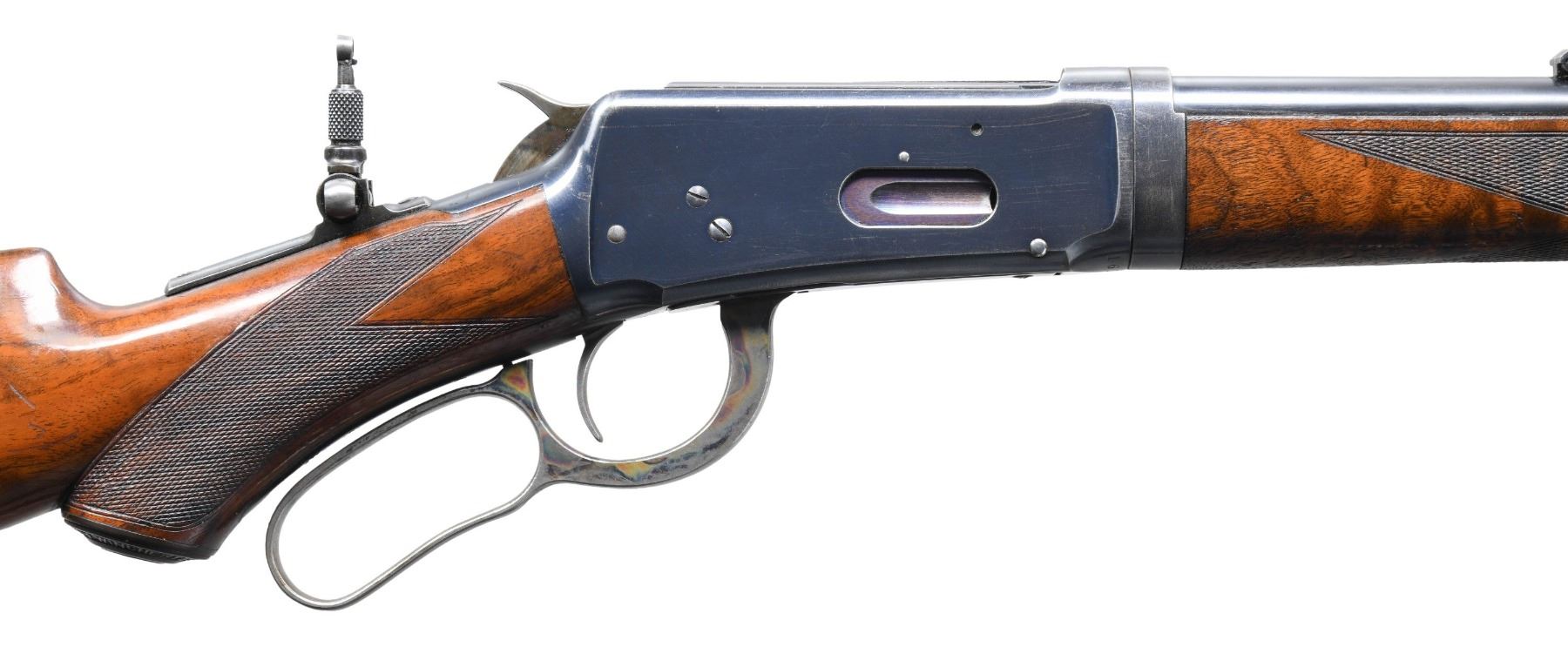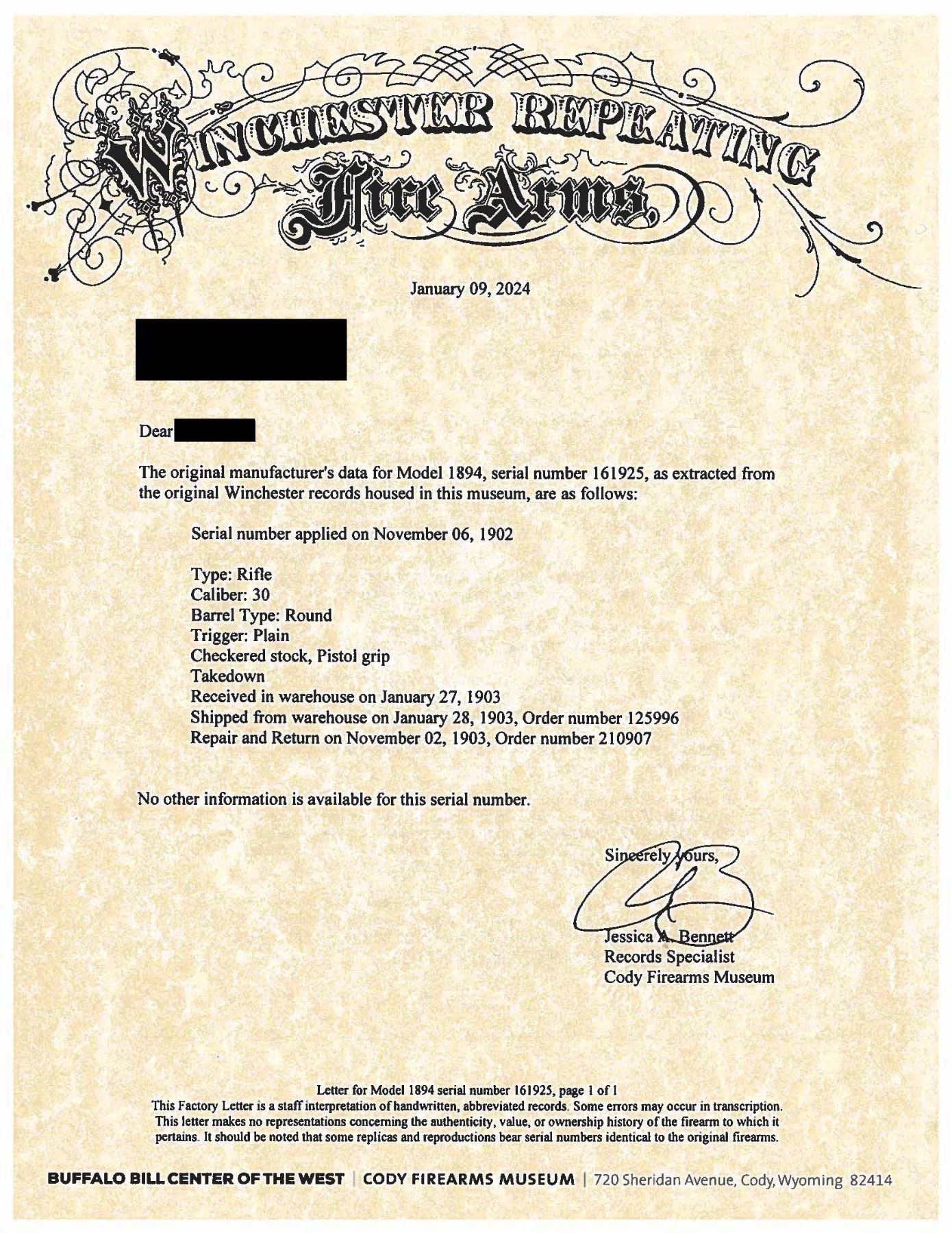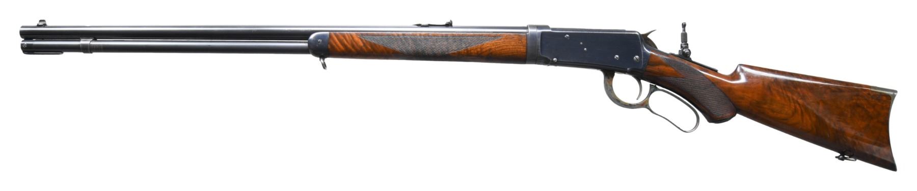 RIFLE. Cal. 30 WCF. S#. 161925. Bbl. 26" round. Marble No. 3 white bead front, express rear with a combination tang sight. Full length mag. Takedown action. Blue finish with case colored hammer, lever and crescent steel buttplate. Forearm & hard rubber capped pistol grip stock of XX fancy walnut have style H checkering. Left inside of the lower tang is stamped with assembly # "15846" followed by wood grade "XX". Top tang channel of the stock is unmarked. UNATTACHED ACCESORIES: Cody Firearms Museum letter stating: Type: Rifle / Caliber: 30 / Barrel Type: Round / Trigger: Plain / Checkered stock, Pistol grip / Takedown / Received in warehouse on January 27, 1903 / Shipped from warehouse on January 28, 1903, Order number 125996 / Repair and Return on November 02, 1903, Order number 210907". CONDITION: fine, retaining 90% lightly worn blue showing carry wear with scattered light scratches. Lever has nicely visible case colors remaining on its sides. Original wood finish shows scratches & marks. Sound action. Bright near excellent bore. (25-4953/DS). CURIO. $10,000-15,000.