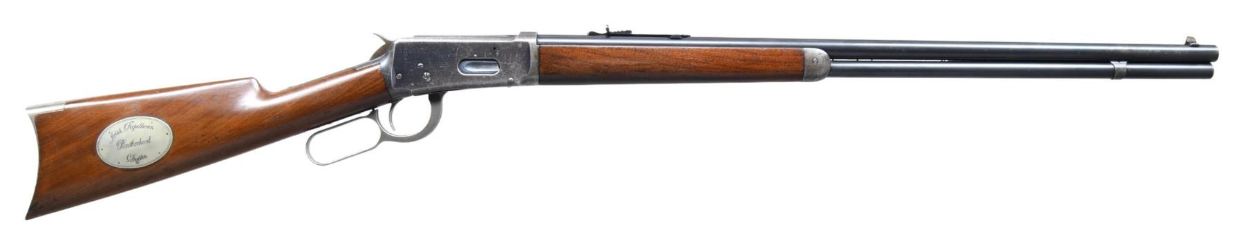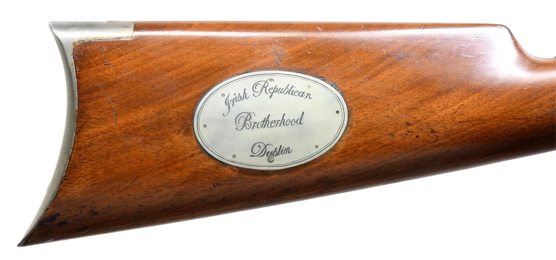 IRISH REPUBLICAN BROTHERHOOD PLAQUE. Cal. 30 WCF (30-30). S# 396657. Bbl. 26" rnd. Original sporting sights. Full length mag. Blue finish with case colored hammer and lever. Walnut forearm and straight grip stock with crescent steel buttplate. Right side of stock has 2 7/8" German silver oval plaque marked "Irish Republican/ Brotherhood/ Dublin". Mfg. in 1907. CONDITION: bbl. and mag. tube retain 80% lightly worn blue showing spots of surface oxidation. Action retains 60% dull worn blue with scattered flaking, surface corrosion, and wear spots. Hammer and lever retain traces of case colors. Wood has worn original finish showing scratches and marks. Bore retains lightly worn rifling. Very interesting rifle deserving of additional research.(25-1758/DS). CURIO. $2,000-4,000.