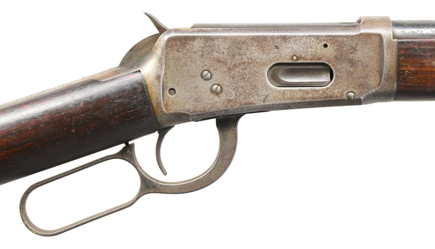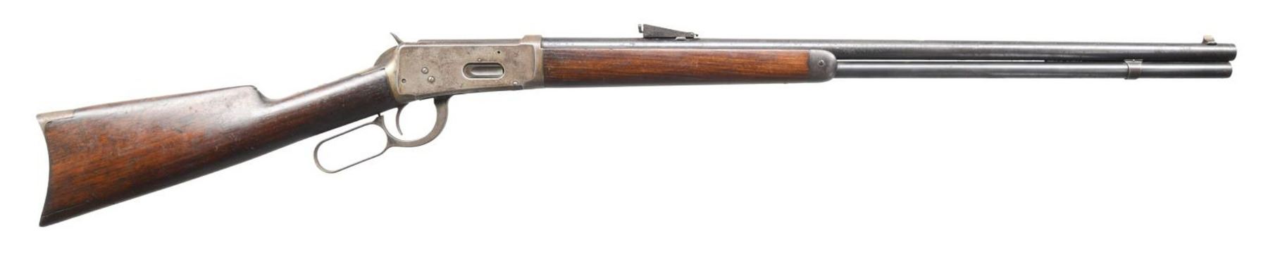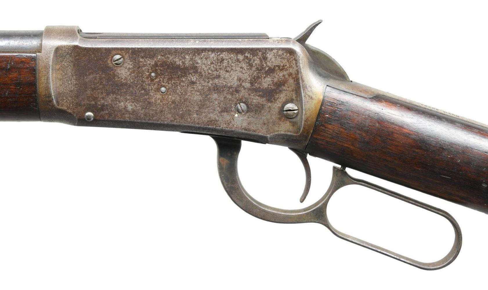 Cal. 32 WS. S# 279205. Bbl. 26". Model 1894 lever action rifle mfg. by Winchester in 1903. The top of the bbl. is marked w/ Winchester's 2 line address, having the cal. designation marked at the breech. Blued finish w/ plain wood furniture. Brass tip blade front sight w/ Winchester Special Smokeless Powder rear sight. CONDITION: receiver exhibits a mottled gray patina w/ moderate pitting & discoloration overall. Bbl. & mag. tube retain lg. amounts of their original finish, exhibiting surface oxidation overall. Bright bore, exhibiting scattered spots of pitting & strong rifling throughout. Wood furniture exhibits scattered marks & minor impressions from storage & handling w/ a crack on either side of the buttstock around the toe, stemming from the buttplate. (23-5641/MLW). CURIO. $600-900.