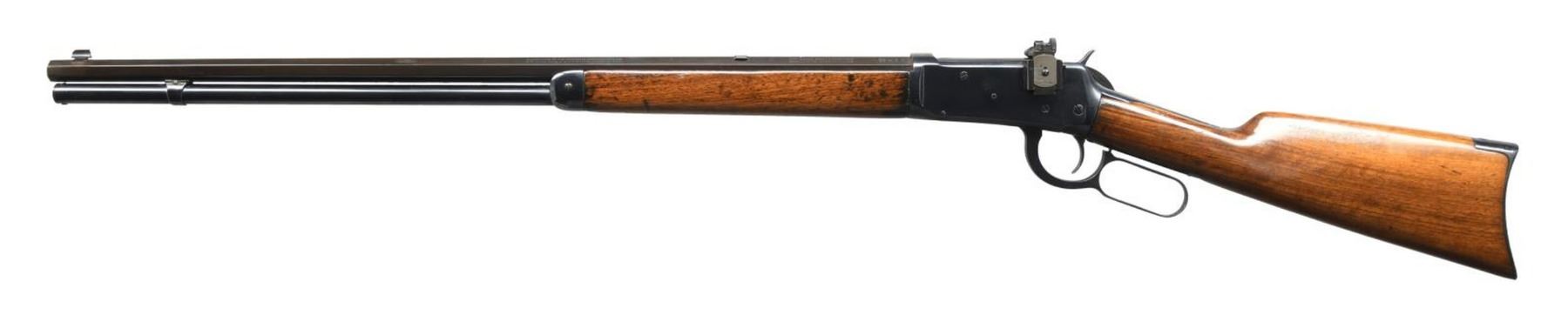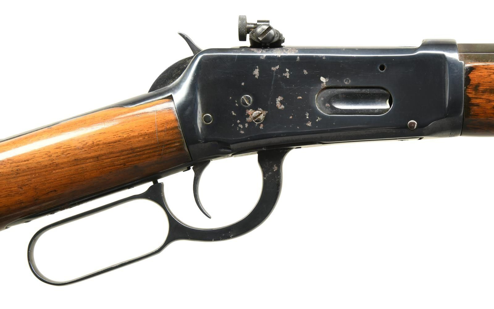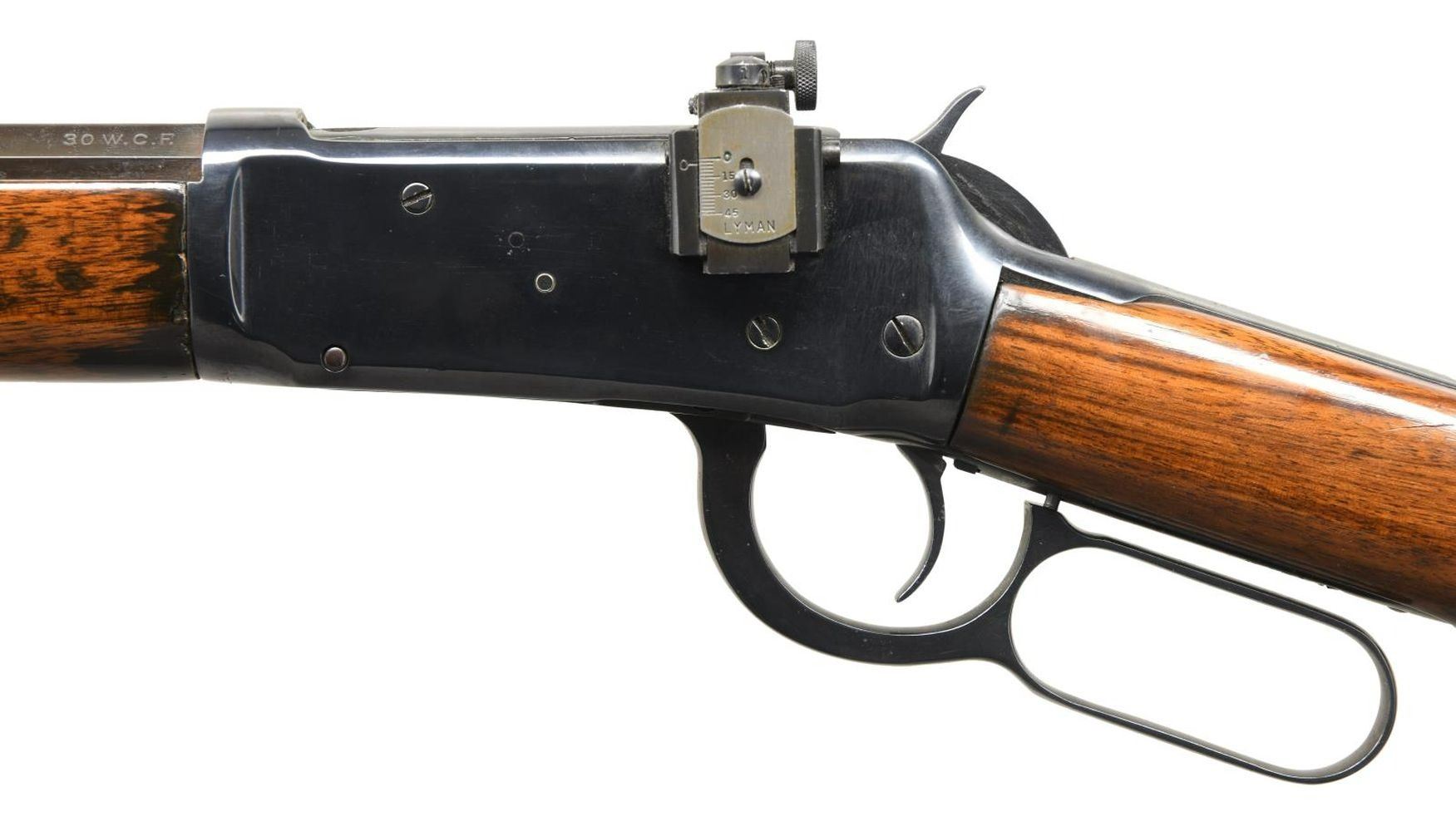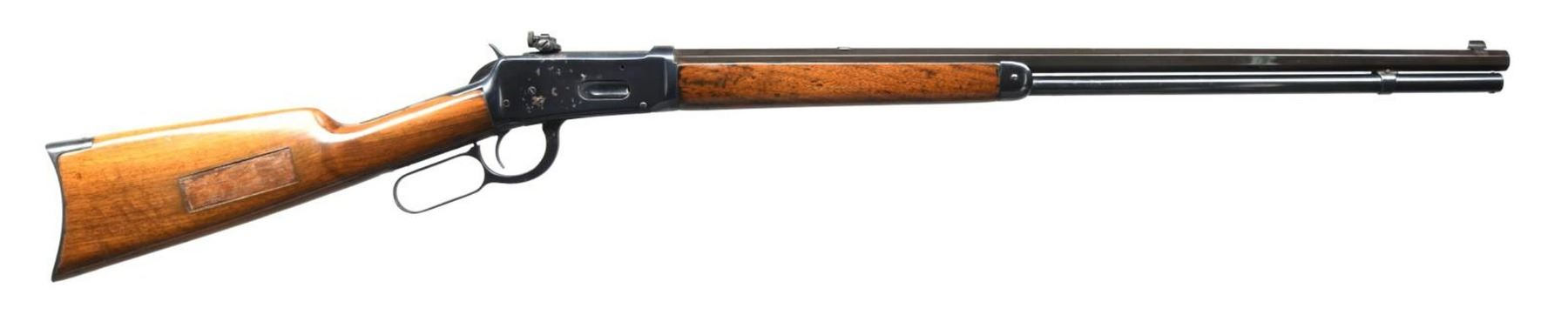 Cal. 30 WCF. S# 514140. Bbl. 26". Model 1894 lever action rifle. Mfg. by Winchester in 1910. The left flat of the octagonal bbl. is marked w/ Winchester's 2 line address & the cal. designation marked at the breech. Metal components exhibit a reapplied blue finish. Plain straight grip wood buttstock & forend have been sanded & revarnished. Right side of buttstock exhibits a rectangular cutout, likely for a no longer present plaque. Dovetailed blade front sight w/ receiver mounted Lyman aperture rear sight. CONDITION: metal components retain the vast majority of their reapplied blue finish, exhibiting some spots of oxidation on the right side of the frame & lever w/ some scattered spots of pitting beneath the finish. Dark pitted bore exhibiting fair rifling throughout. Wood furniture shows some scattered marks from handling & storage, but otherwise remains sturdy & serviceable. (23-5733/MLW). CURIO. $400-600.