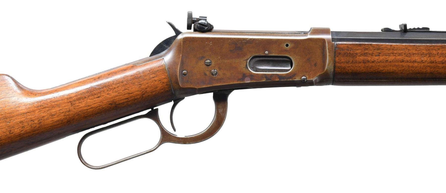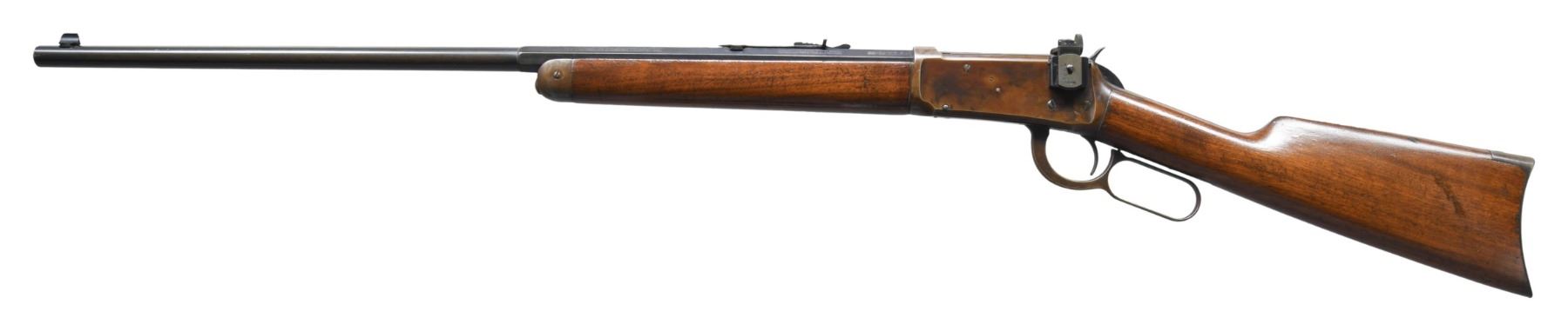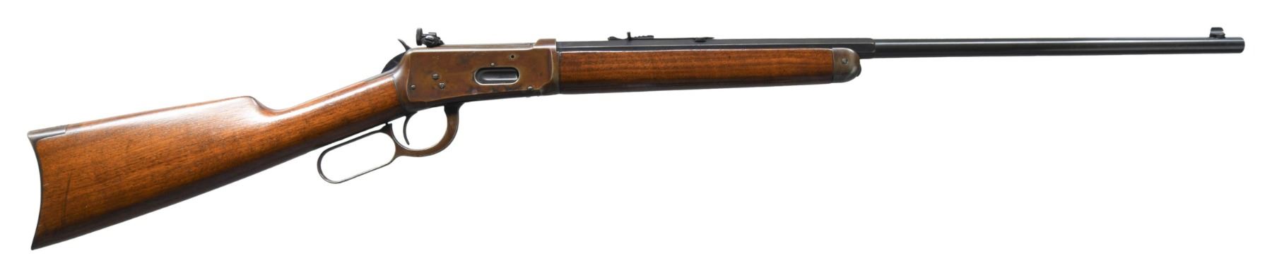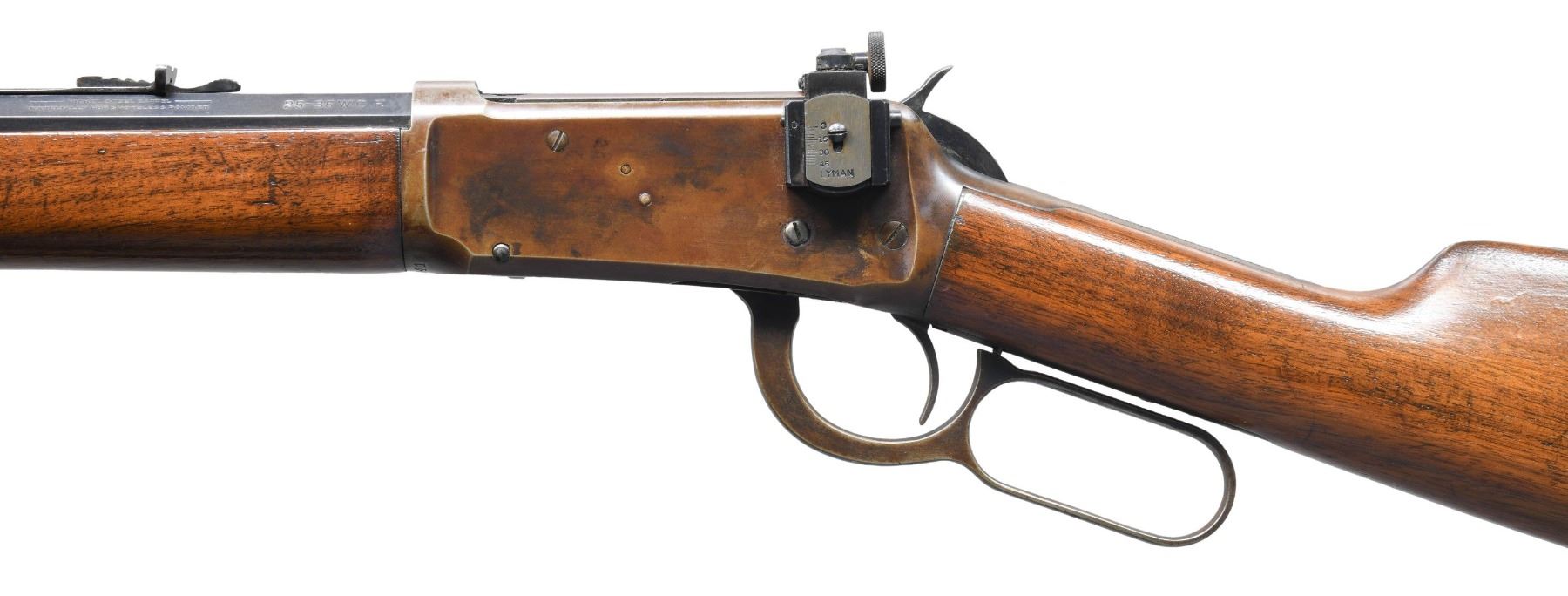Cal. 25-35 WCF. S#. 828941. Bbl. 26" octagon to rnd. Redfield replacement front sight with bead, original flattop sporting rear sight with a Lyman No. 66MB receiver sight having a disc aperture. Button mag. Blue finish. Walnut forearm and straight grip stock with crescent steel buttplate. Mfg. in 1918. CONDITION: bbl. retains 60% dull blue showing touch up finish. Action and fittings have a brown coloration from application of cold blue finish. Sanded and refinished stocks show handling marks with heavy dents on the right side of the butt. Sound action. Bore has a slightly darkened appearance retaining sound rifling. (25-5133/DS). CURIO. $1,200-1,800.