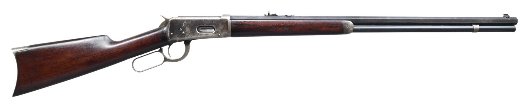 Cal. 30 WCF (30-30). S# 340161. Bbl. 26" octagon. Marbles Sheard replacement front sight with Marbles elevator adj. replacement sporting rear sight. Full length mag. Blue finish with case colored hammer and lever. Top tang has filler screw and added hole for sight attachment. Walnut forearm and straight grip stock with crescent steel buttplate. Mfg. in 1906. CONDITION: bbl. and mag. tube retain over 60% dull lightly worn blue showing edge wear with spots of pitting. Action retains 40% dull worn blue with carry wear showing scratches and small spots of light pitting. Sanded and refinished wood show some remaining scratches and marks. Sound action. Bore has slightly darkened appearance retaining sound rifling. PROVENANCE: Estate of Russell Dickerman. (25-1837/DS). CURIO. $700-1,100.