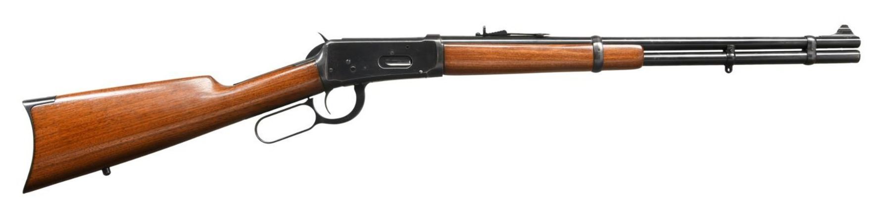 CARBINE. Cal. 30-30. S# 373245. Bbl. 20". Model 1894 lever action saddle ring carbine mfg. by Winchester in 1906. Entire carbine has been restored, with the bbl. no longer retaining any markings and/or having been replaced. Left side of receiver was drilled and tapped and has been filled in at one point. Metal components exhibit a reapplied blue finish. Straight grip smooth wood buttstock and forend have been sanded and revarnished. Aftermarket ramped ivory beaded front sight and dovetailed semi-buckhorn V-notch rear sight, which has been modified via a larger V-notch. CONDITION: metal components retain large amounts of their reapplied blue finish, exhibiting some areas of wear, some spots of oxidation, as well as some scattered spots of pitting beneath the bluing. Mirror bore, exhibiting well defined rifling throughout. Wood furniture shows a few minor handling marks, but otherwise remains sturdy and serviceable. (23-5080/MLW). CURIO. $400-600.