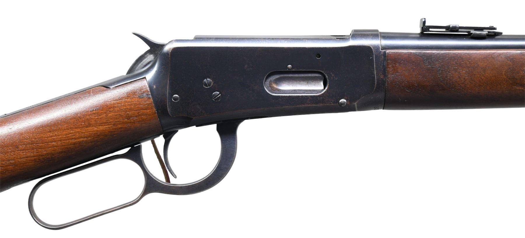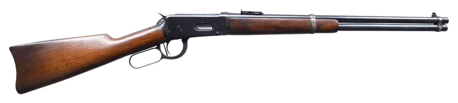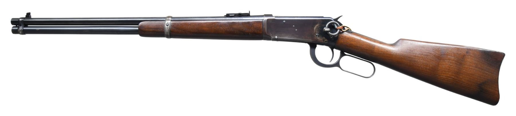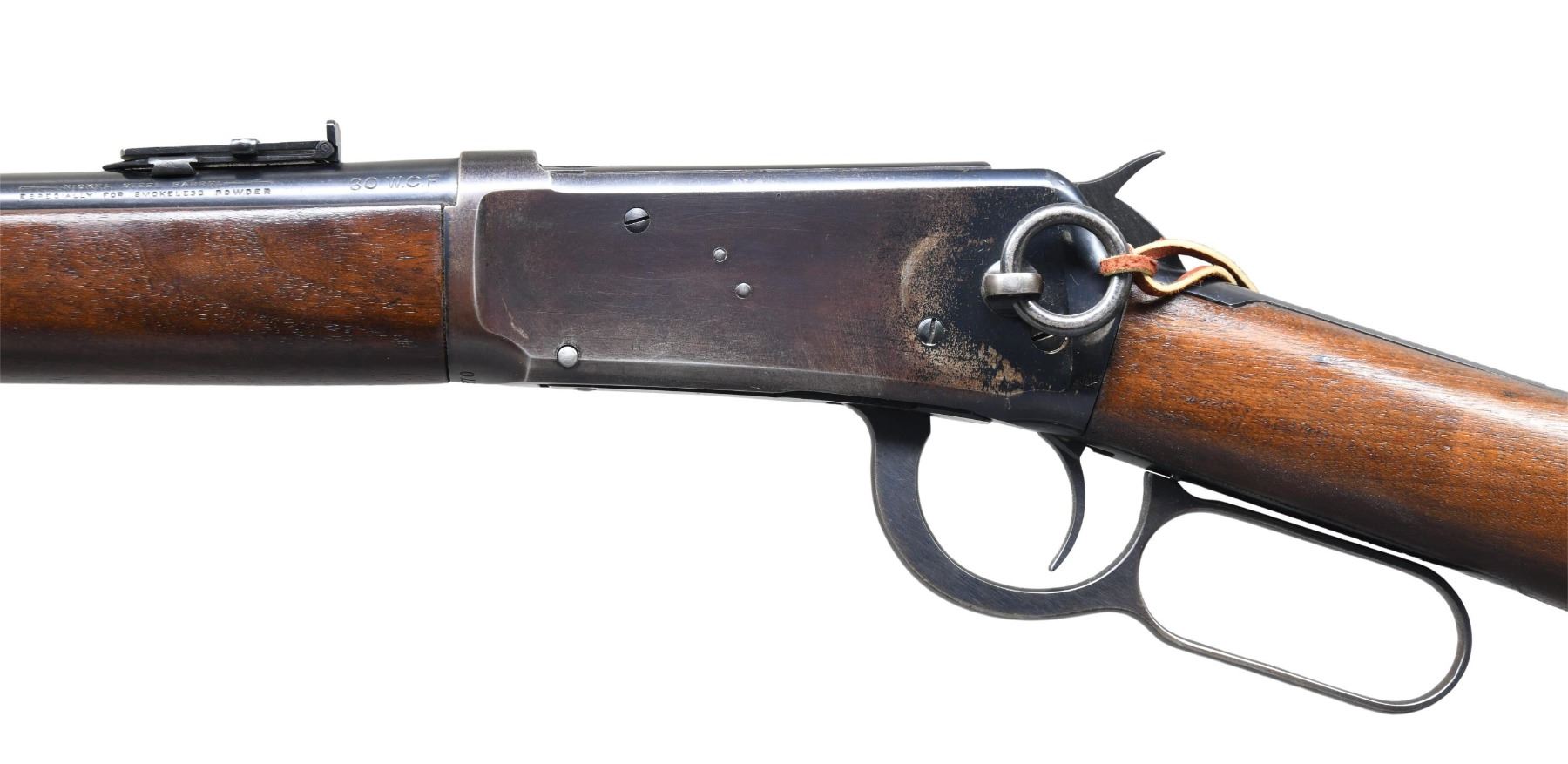 CARBINE. Cal. 30 WCF (30-30). S# 835570. Attractive conditionally as most examples from this time period were notorious for flaking finish of the receiver due to the high nickel content found in the production of these actions. Bbl. 20" rnd. carbine style. Pinned blade front sight has added bevel to upper edge. Graduated leaf rear sight. Full length mag. Left side of receiver has saddle ring with added leather thong. Blue finish. Band fastened walnut forearm and straight grip stock with steel carbine buttplate. Mfg. in 1918. CONDITION: over 80% lightly faded original blue showing carry wear with spots of flaking on the receiver. Forearm has lightly worn original finish showing scratches and marks. Stock has been lightly sanded and refinished showing a few small marks. Bore is generally bright with strong rifling. (25-1718/DS). CURIO. $2,000-3,000.