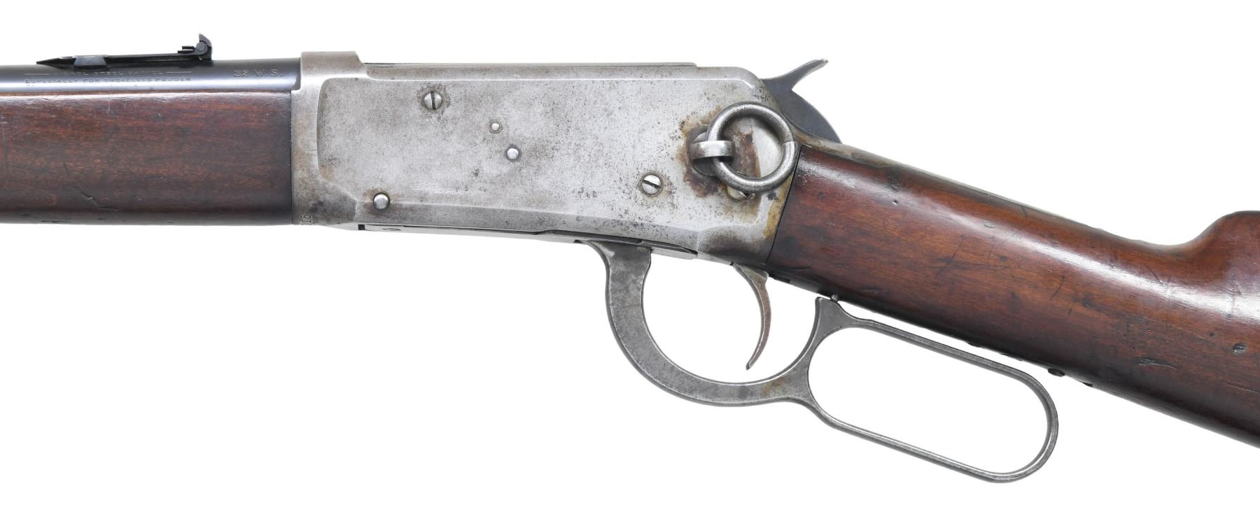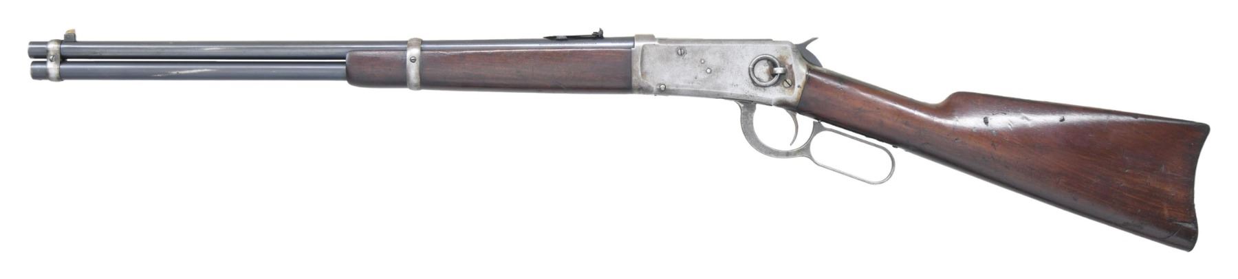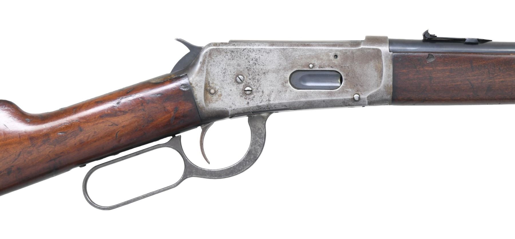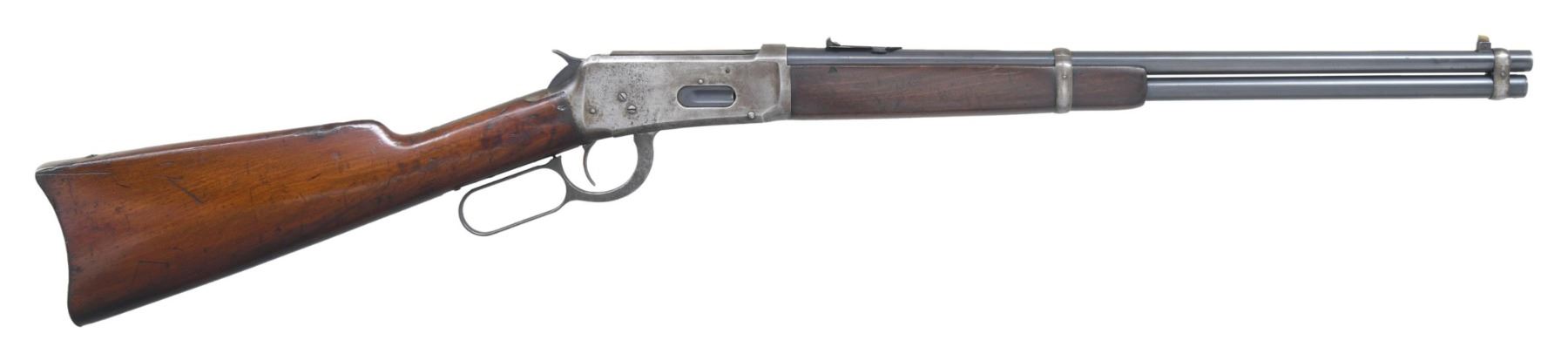 CARBINE. Cal. 32 WS. S# 470015. Bbl. 20". Pinned blade front sight with Winchester express rear sight. Full length mag. Blue finish. Band fastened gumwood forearm and straight grip stock with steel carbine buttplate. Mfg. in 1908. CONDITION: bbl. and mag. tube retain over 80% dull lightly faded blue. Action has faded to gray showing spots of very light pitting. Stock and forearm have added finish over scratches, marks, and deep dents. Sound action. Bore is generally bright with lightly worn rifling showing a very light ring near the front sight. PROVENANCE: Estate of Russell Dickerman. (25-1855/DS). CURIO. $800-1,200.