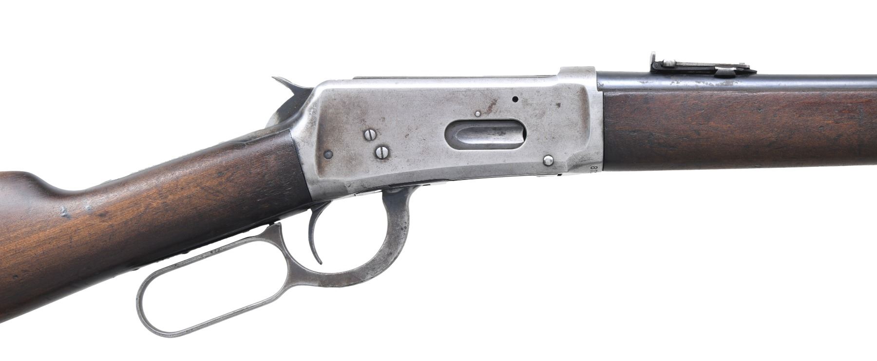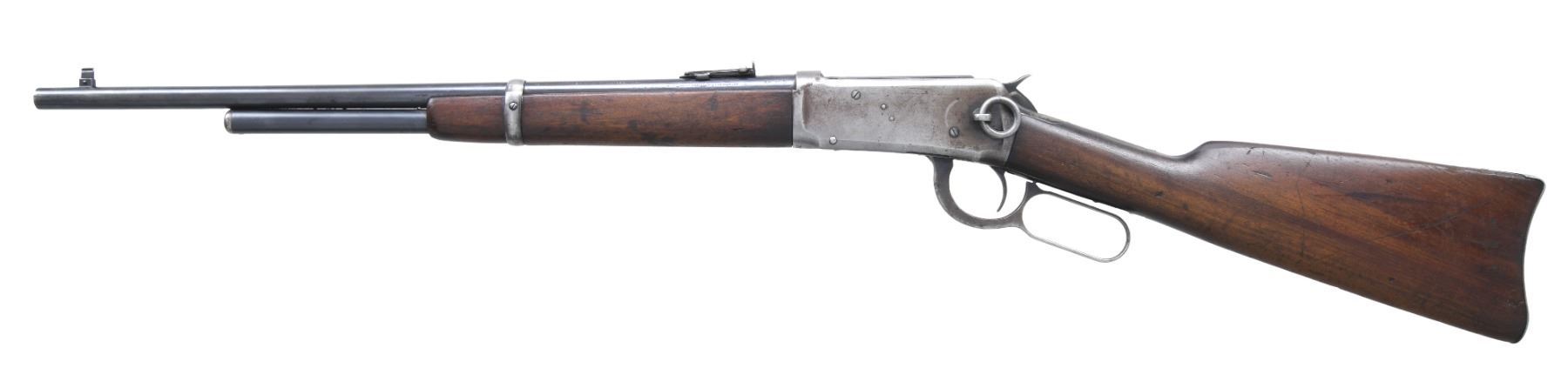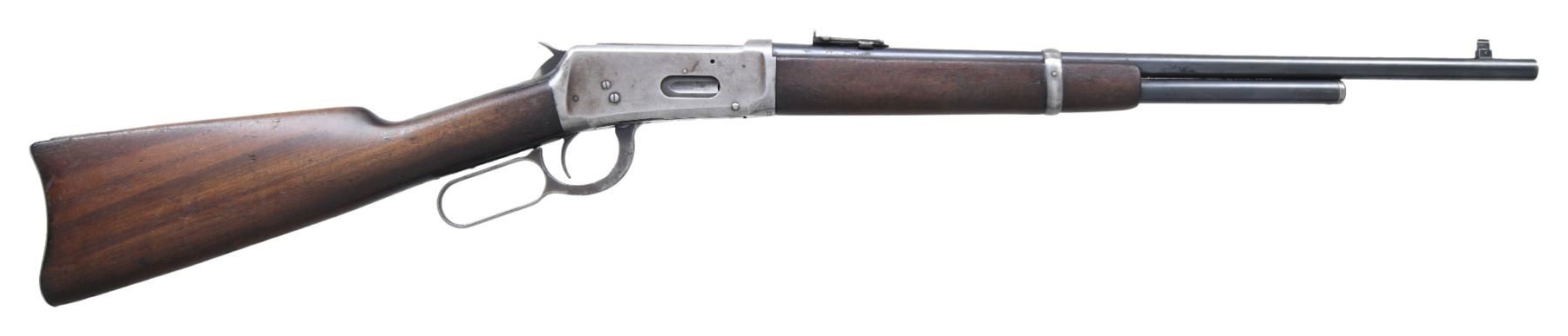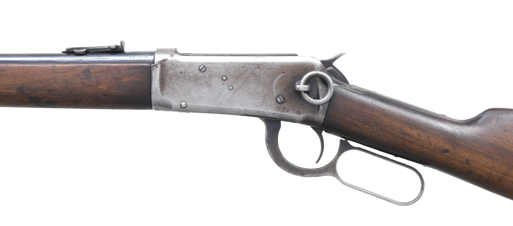 Cal. 32 WS. S# 871358. Bbl. 20". Replacement gold bead pinned blade front sight w/ carbine leaf rear sight. 3/4 length mag. Action has saddle ring on left side. Gumwood forearm & stock w/ steel carbine buttplate. Mfg. 1920. CONDITION: bbl. & mag. tube retain 70% blue, showing spots of corrosion. Action has faded to gray. Stocks have worn finish, showing numerous scratches & marks. Bore shows scattered pitting w/ worn rifling. (25-501/DS). CURIO. $1,000-1,500.