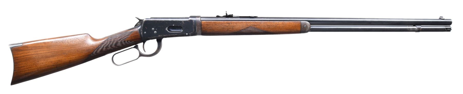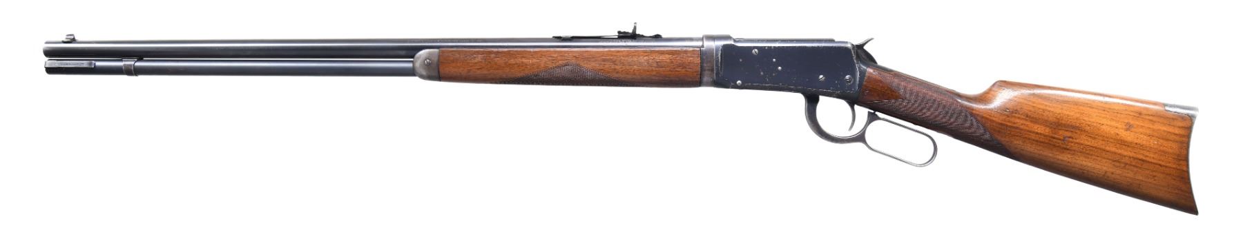 LEVER ACTION RIFLE. Cal. 38-55. S#. 1049830. Bbl. 26" round, takedown style. Sporting sights. Full length mag. Blue finish. Walnut forend & straight grip stock w/ crescent steel buttplate. Stock & forend have style I checkering that may have been added after mfg. The inside of the lower tang & top tang channel of the stock do not show any assembly numbers. UNATTACHED ACCESORIES: Cody firearms museum records check listing the following: Serial number applied on June 29, 1929 / Configuration information not available. CONDITION: over 80% lightly worn original blue showing carry wear w/ spotted flaking on the action. Wood has lightly worn finish & checkering showing scattered handling marks. Bright bore has strong rifling. (25-736/DS). CURIO. $4000-6000.