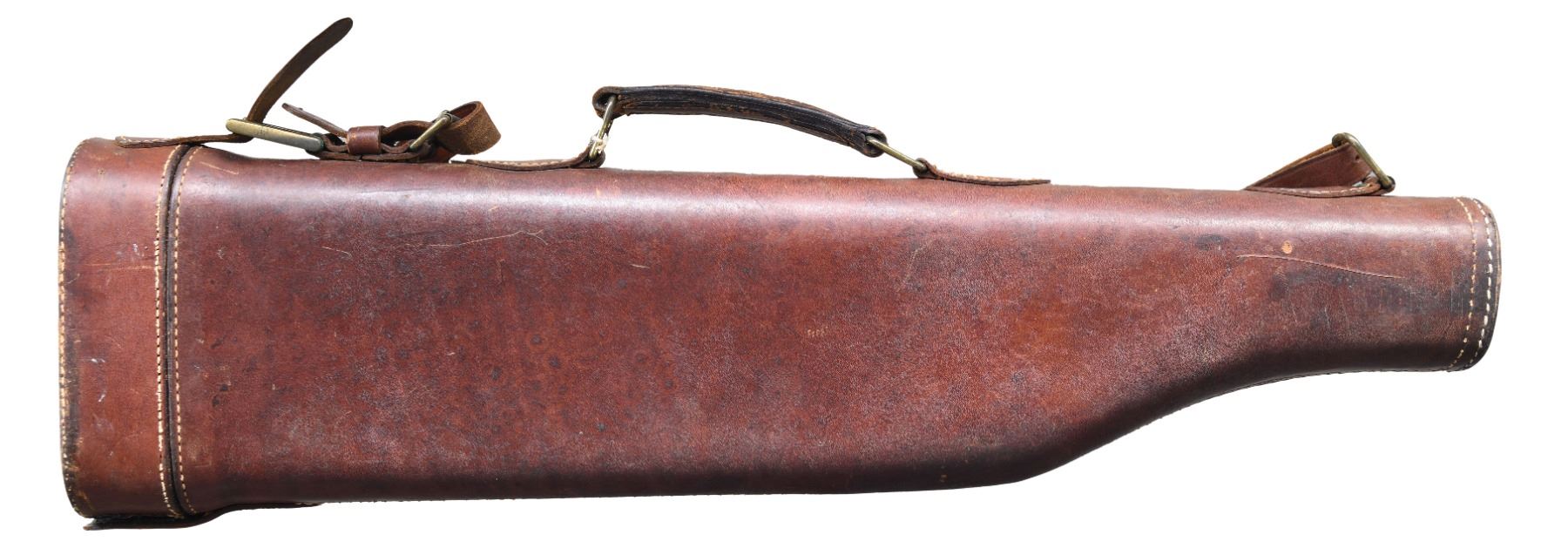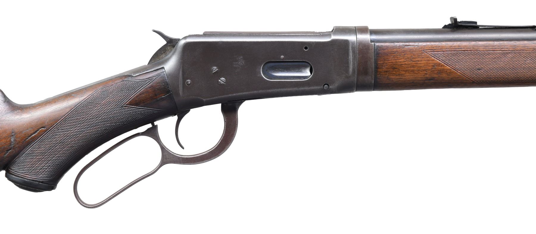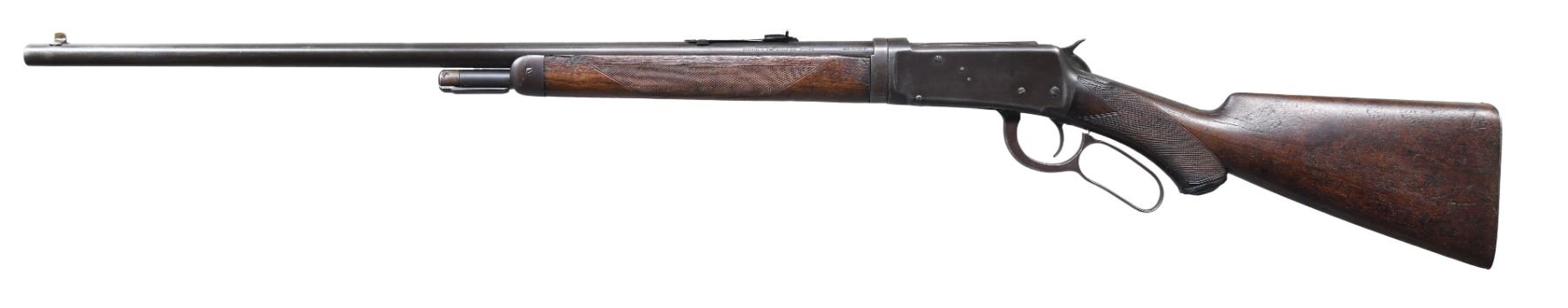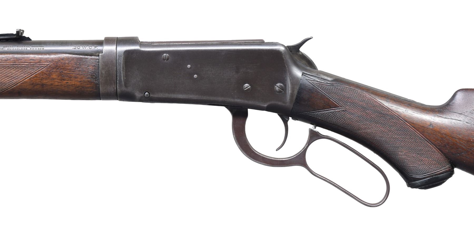 Cal. 30 WCF. S# 613722. Bbl. 26" round. Sporting front sight having brazed blade. Flat top sporting rear sight w/ replacement elevator. Half length takedown mag. Forearm & pistol grip walnut stock w/ checkered steel buttplate have added checkering & hard rubber grip cap. Mfg. 1911. UNATTACHED ACCESSORIES: leather leg of mutton case. CONDITION: metal has faded to a dark gray. Wood shows heavy wear & handling marks. Forearm has cracks & chips along bbl. channel. Stock is cracked through the wrist w/ a small crack extending from buttplate peak. Mag. tube has one large dent. Dark pitted bore. (24-6942/DS). CURIO. $1,500-2,250.