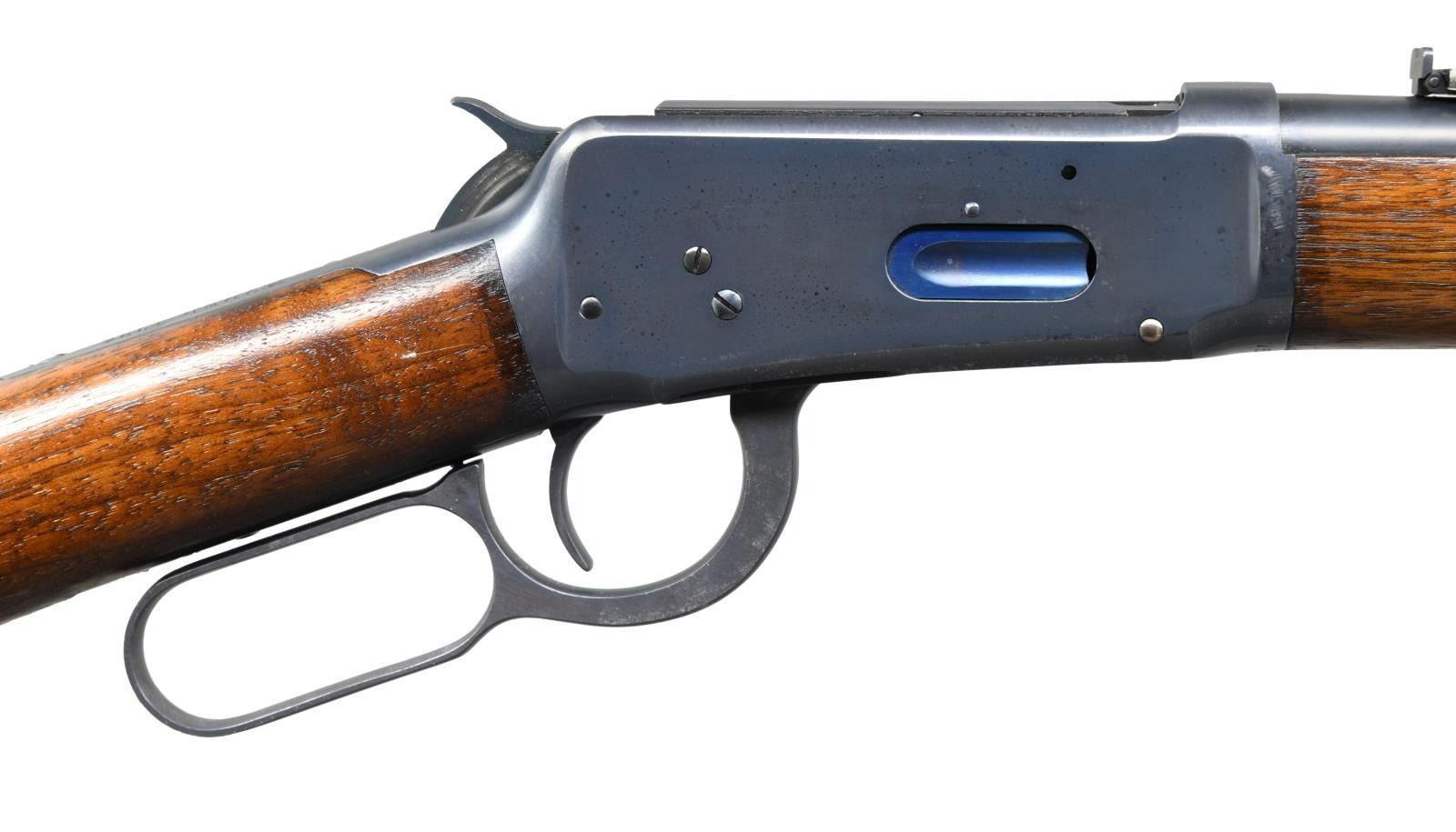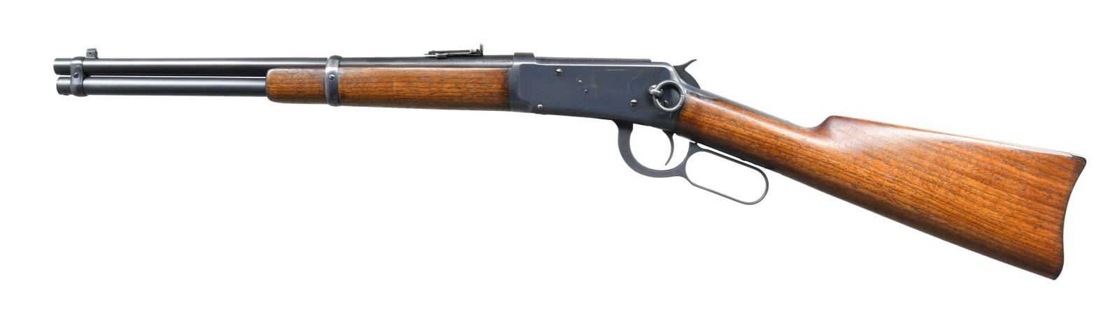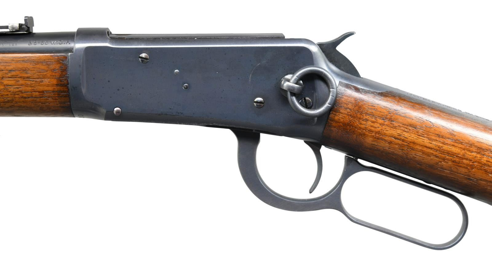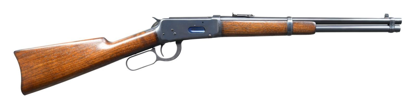 SRC. Cal. 38-55 WCF. S# 753920. Bbl. appears to be shortened to 16" round carbine style. Pinned blade front sight w/ carbine leaf rear sight. Full length mag. Blue finish. 8" Trapper length walnut forearm (1" shorter than standard). Straight grip walnut stock w/ steel carbine buttplate. Serial number indicates 1914 mfg. CONDITION: over 95% finely reblued finish showing marks & spots of finish loss on action. Area around front sight boss shows small holes & plum coloring where it was welded to the bbl. Wood has good open grain refinish. Very good bright bore. PROVENANCE: The Collection of Edward Scott Meadows. (24-715). CURIO. $5,000-7,000.