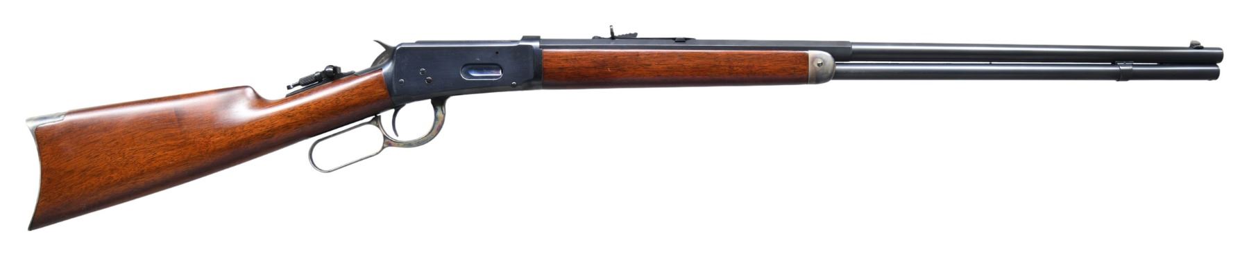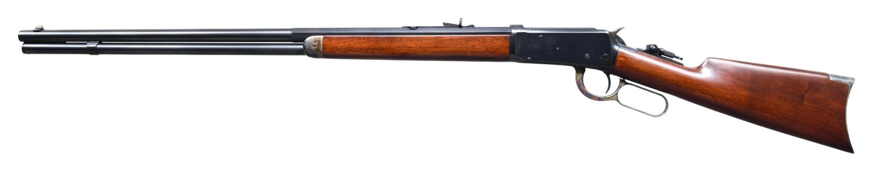 Cal. 38-55. S# 227709. Bbl. 26" octagon to round. Proper sporting front with replacement elevator adj. rear sight. full length mag. Blue & case colored finish. Walnut forearm & stock have case colored crescent steel buttplate. Mfg. 1901. UNATTACHED ACCESSORIES: Invoice from Turnbull mfg. detailing work done on this specific rifle. CONDITION: restored rifle, retaining nearly all blue & case colored metal refinish. Caliber marking on top flat & marking left bbl. flat appear to be recut. Winchester address marking on top of bbl is very weak from polishing. Sanded & refinished wood show some remaining marks. Bottom of forearm has spots of finish loss. Dark pitted bore. (25-3410/DS). CURIO. $2,500-3,500.