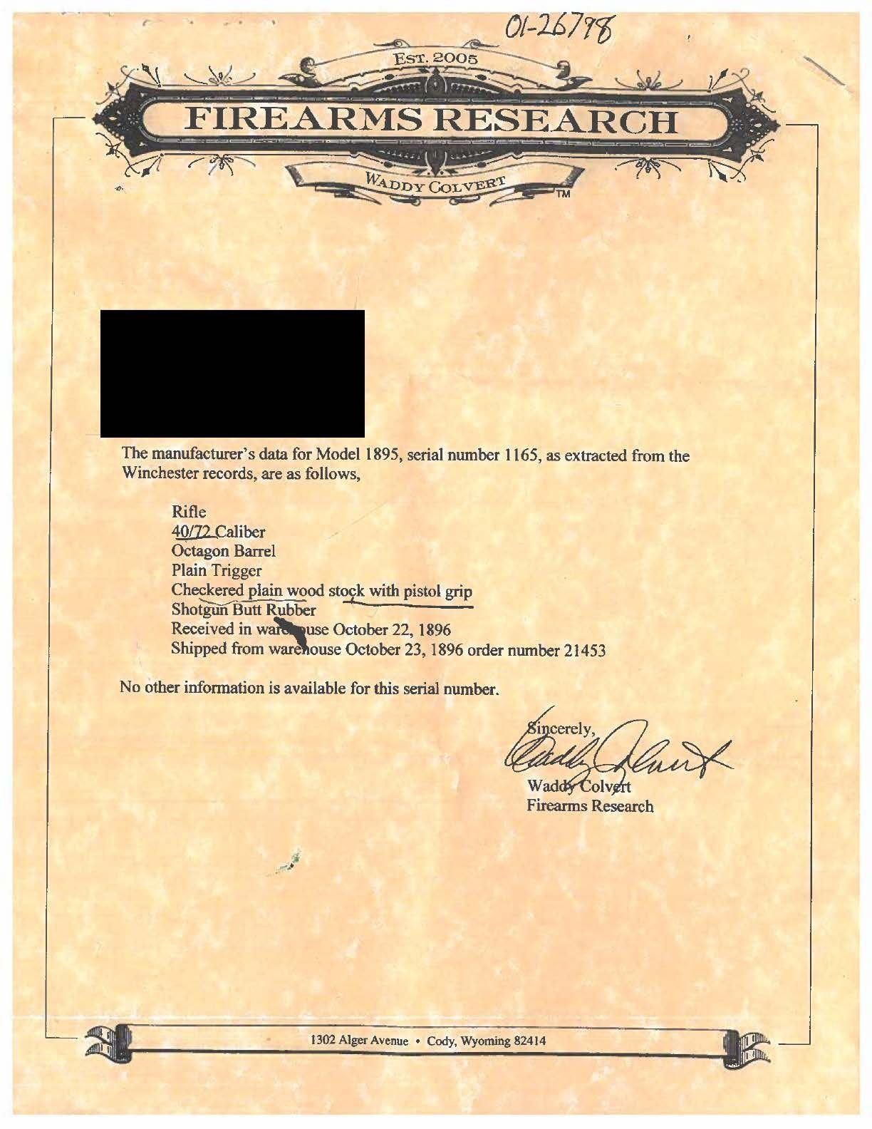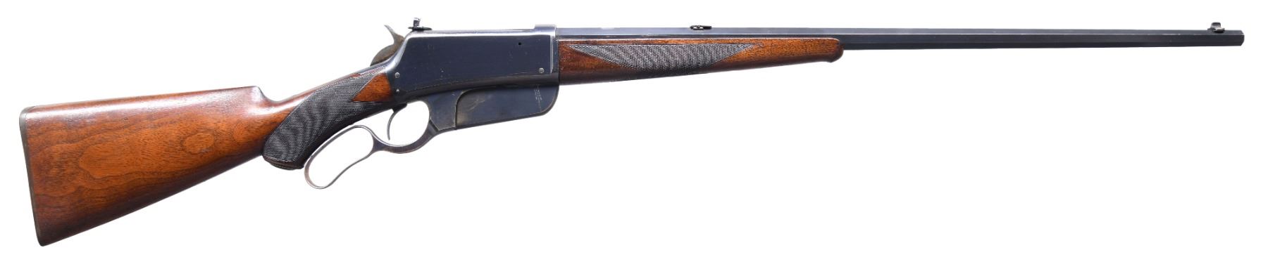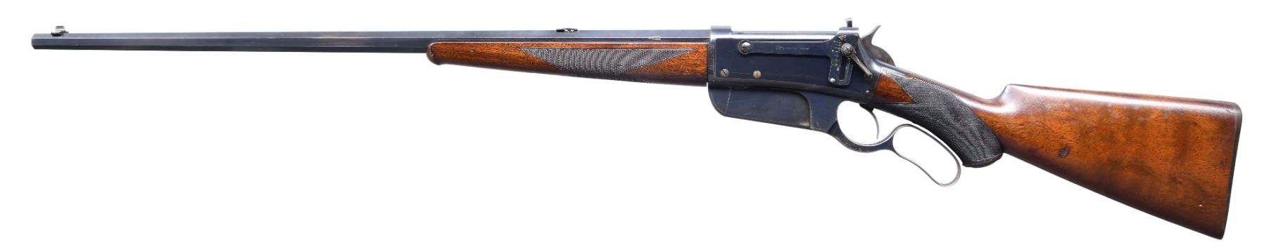 ACTION RIFLE. Cal. 40-72 WCF. S# 1165. Bbl. 26" tapered octagon. Lyman No.3 bead front sight, Lyman No.6 folding leaf rear sight w/ Lyman No.21 "Climbin Lyman" receiver sight. Blue finished w/ case colored hammer. Schnable tipped forearm w/ ebony insert & hard rubber capped pistol grip walnut stock w/ hard rubber shotgun buttplate. Stock & forearm have style H factory checkering. Left inside of lower tang is marked "RB" followed by assembly number "3230" followed by "CHS". Top tang channel of stock has pencil marked matching assembly number. WEIGHT: 8 lbs, 6.8 oz. UNATTACHED ACCESSORIES: Waddy Colvert firearms research letter listing the following information, "Rifle / 40/72 Caliber / Octagon Barrel / Plain Trigger / Checkered plain wood stock with pistol grip / Shotgun Butt Rubber / Received in warehouse October 22, 1896 / Shipped from warehouse on October 23, 1896 order number 21453". CONDITION: fine. Over 95% original blue showing edge & carry wear w/ fading on lever. Wrench marks are found near breech end of bbl. Wood has lightly worn finish & checkering showing scattered scratches & marks. Bore is generally bright w/ strong rifling showing small spots of light pitting. (01-26798/DS). ANTIQUE. $6,000-9,000.