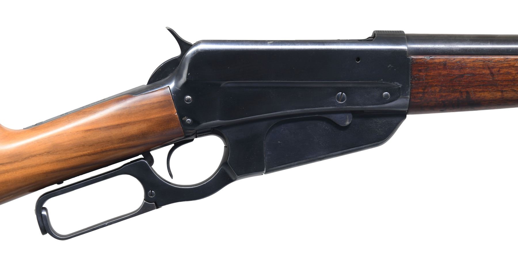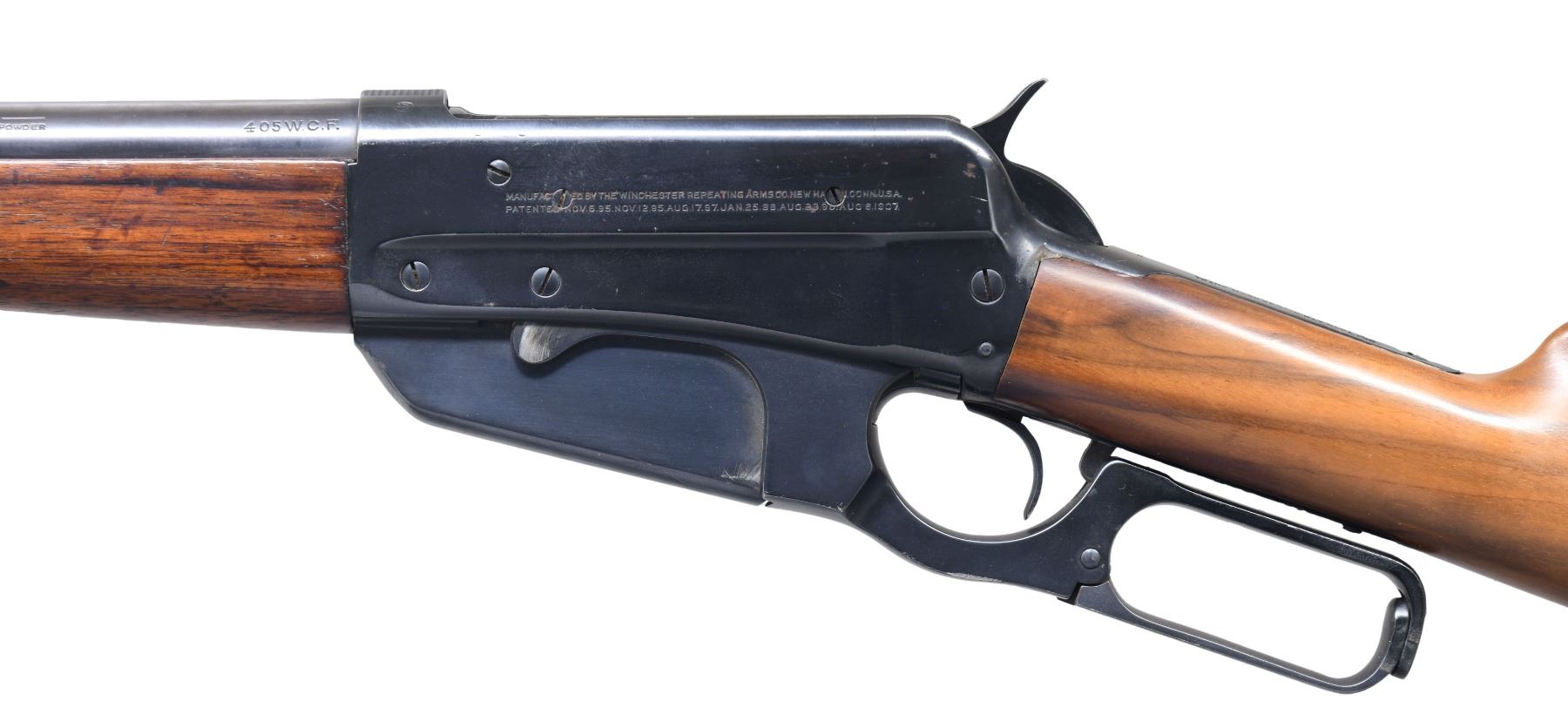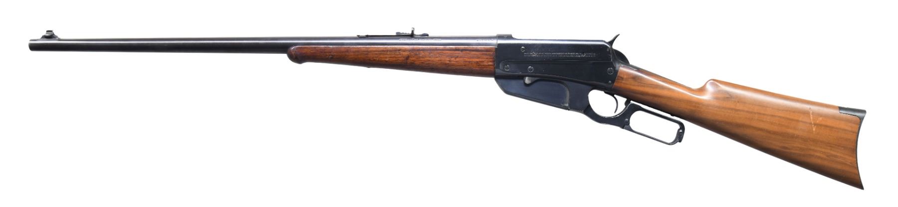 Cal. 405 WCF. S#. 409909. Bbl. 24" round. Ramp mounted bead front sight w/ sporting rear sight. Original schnabel tipped walnut forend w/ ebony insert. Replacement walnut stock using original crescent steel buttplate. Mfg. 1923. CONDITION. Bbl. & action retain over 95% reblued finish. Forend has worn original finish showing scratches & marks. Replacement stock has good finish showing scattered scratches. Good bright bore. (25-1485/DS). CURIO. $2,000-2,900.