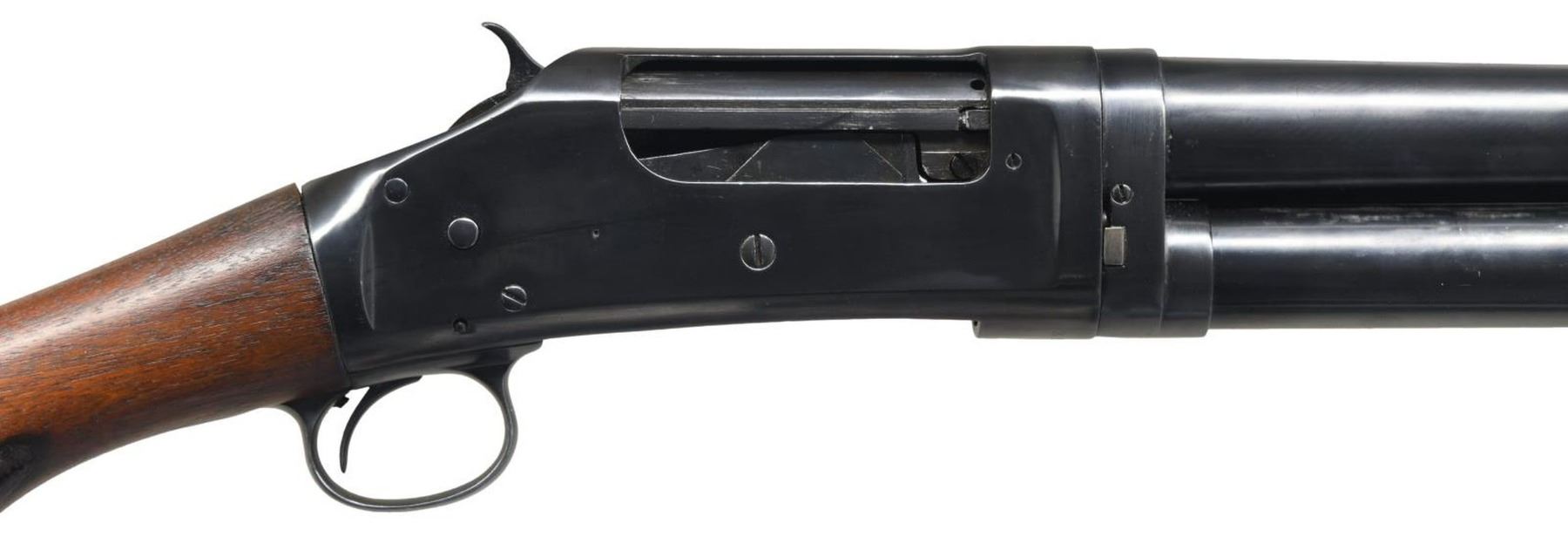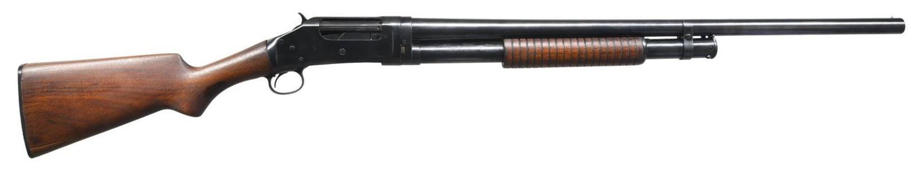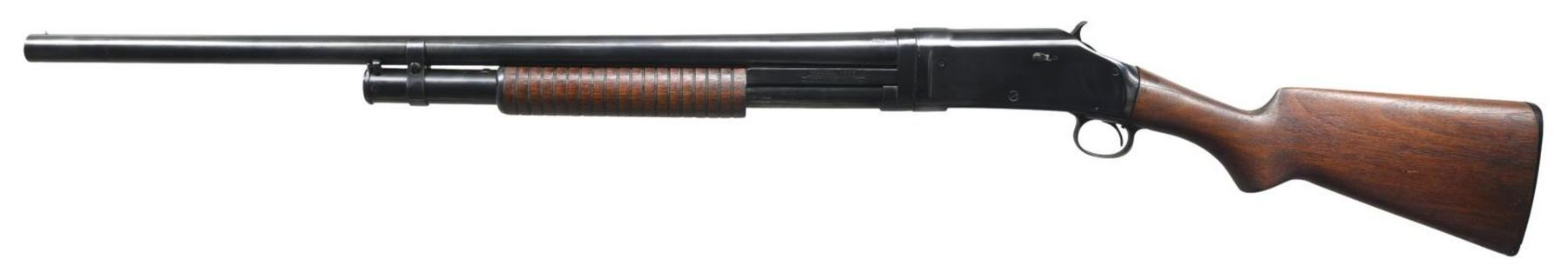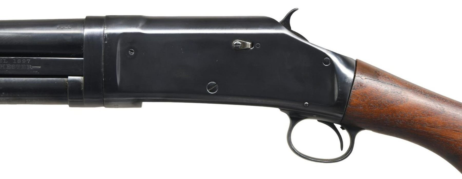 Cal. 12 GA. S# 399033. Bbl. 26 1/4". Model 1897 pump action shotgun mfg. by Winchester in 1909. Top of bbl. is marked with Winchester's mfg. and patent information, followed by the cal. designation, with "FULL" stamped on the left at the breech. Metal components exhibit a reapplied blue finish overall. Plain wood pistol grip buttstock and grooved forend have been sanded and revarnished. Aftermarket brass bead front sight. Receiver and bbl. do not match. CONDITION: metal components retain the vast majority of their reapplied blue finish exhibiting some light wear and some scattered marks from handling and storage. Factory stampings are soft, but remain mostly legible. Bright bore, exhibiting scattered areas of pitting throughout. Buttstock exhibits a crack on the left side at the wrist, with a hairline crack on the right. Left side of buttplate exhibits a crack at the toe. Pump exhibits a previously repaired break that runs the length of the pump. (23-5334/MLW). CURIO. $250-350.