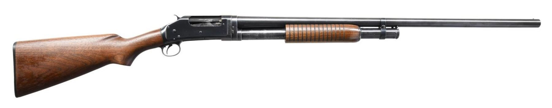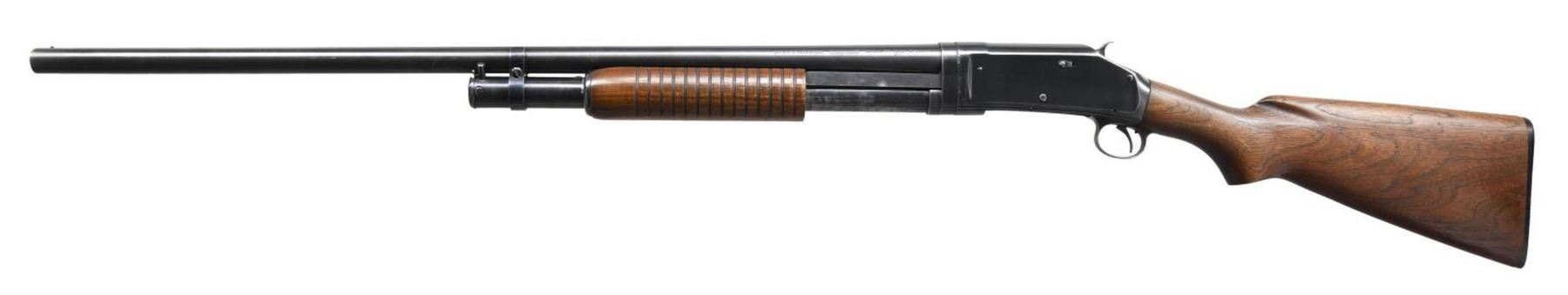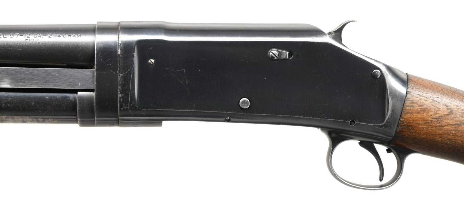 Cal. 12 GA, 2 3/4". S# 438251. Bbl. 30". Model 1897 pump action shotgun mfg. by Winchester in 1910. The left side of the bbl. is marked w/ Winchester's manufacture information followed by the Winchester trademark logo, as well as the model & cal. designations. Metal components exhibit a blued finish w/ the receiver exhibiting an older & nicely reapplied blue finish. Plain wood pistol grip buttstock w/ grooved wood pump. Aluminum bead front sight. CONDITION: receiver retains the majority of its reapplied blue finish, exhibiting some wear that shows through to gray patina. Bbl. retains lg. amounts of its original factory blue finish, exhibiting wear & thinning overall that shows through to gray & brown patinas. Mirror bore exhibiting some light oxidation towards the muzzle. Wood furniture shows some scattered marks from handling & storage but is otherwise good overall. (23-5636/MLW). CURIO. $400-600.