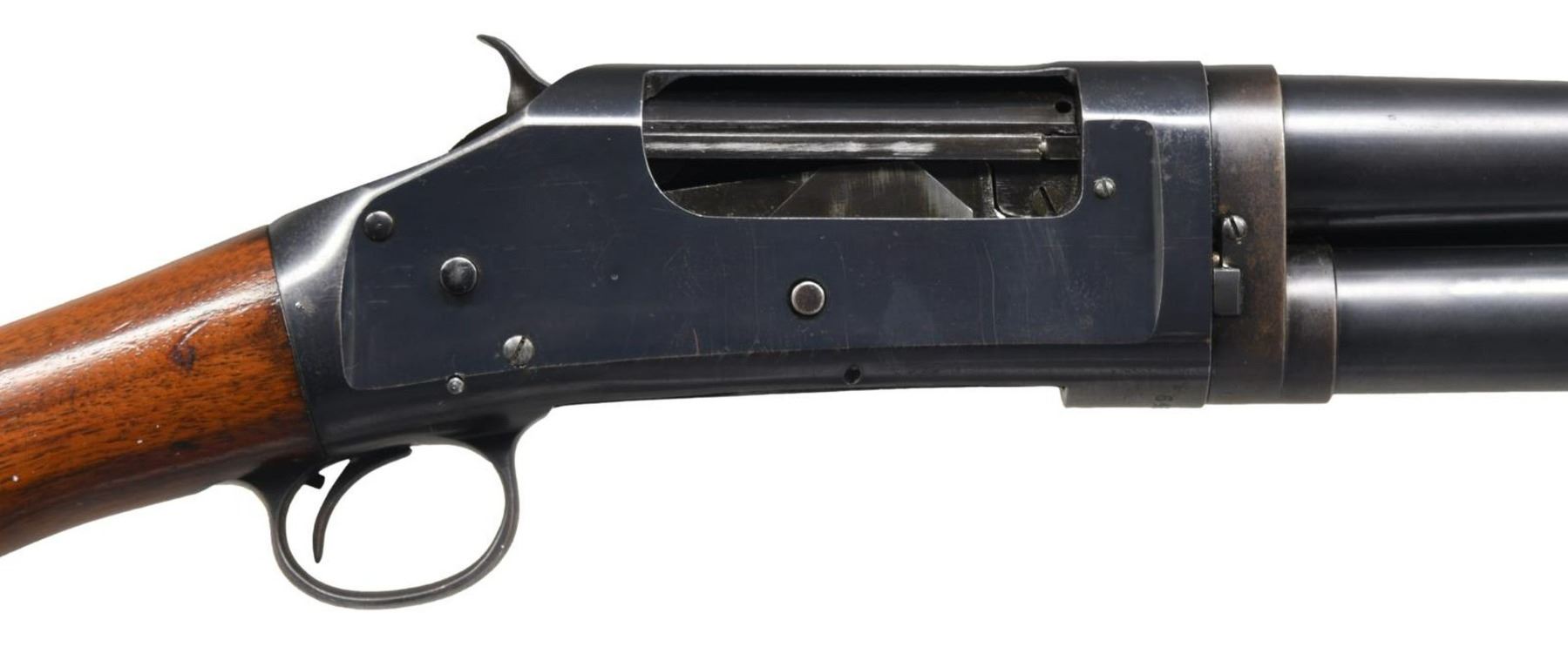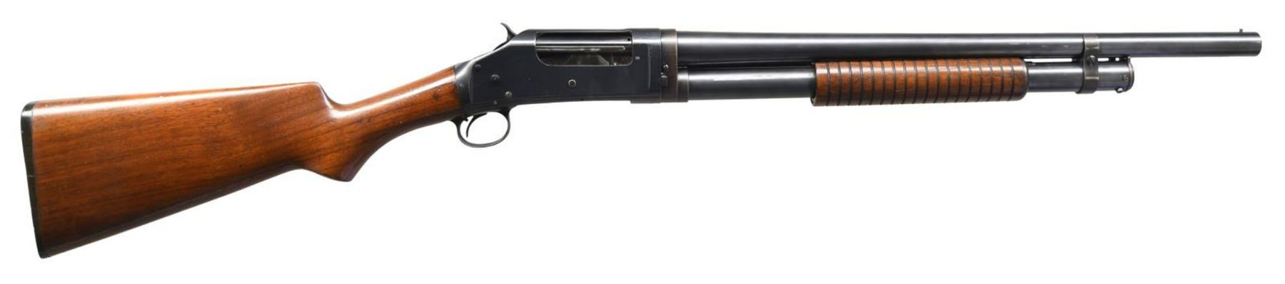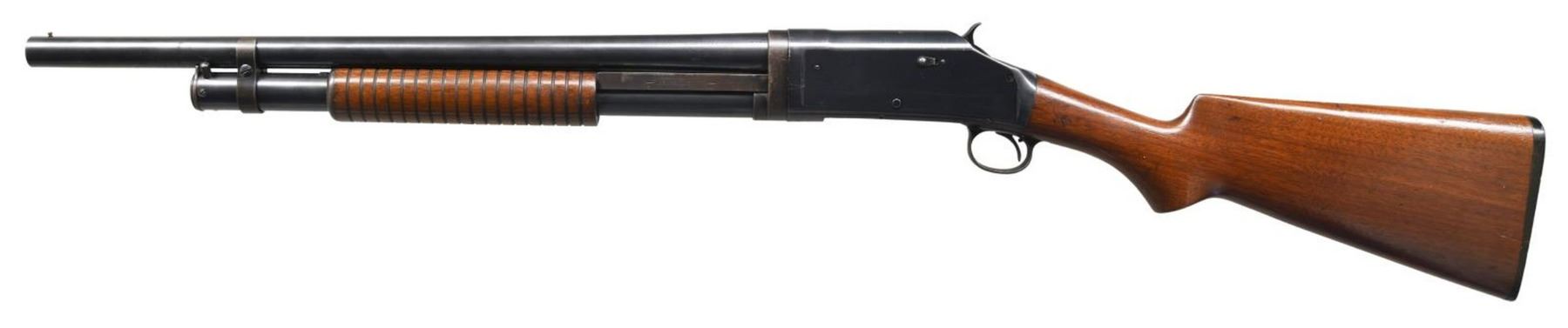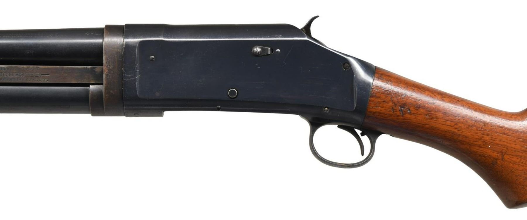 Cal. 12 GA. S# 648640. Bbl. 20 1/2". Model 1897 pump action shotgun in Riot configuration mfg. by Winchester in 1919. The left side of the bbl is marked with Winchester's mfg. information, followed by the cal. designation and "CYL.". Metal components exhibit a blued finish overall. Plain wood pistol grip buttstock with grooved forend. Brass bead front sight. CONDITION: metal components retain large amounts of their original factory blue finish, exhibiting wear, thinning, scattered handling marks, and some areas of mild oxidation overall. Mirror bore, exhibiting mild firing residue throughout. Wood furniture shows scattered marks and dings from handling and storage, but otherwise remains sturdy and serviceable. (23-5493/MLW). CURIO. $500-750.