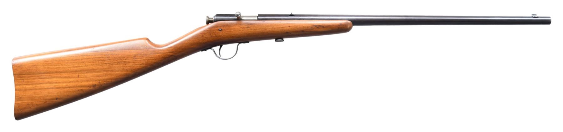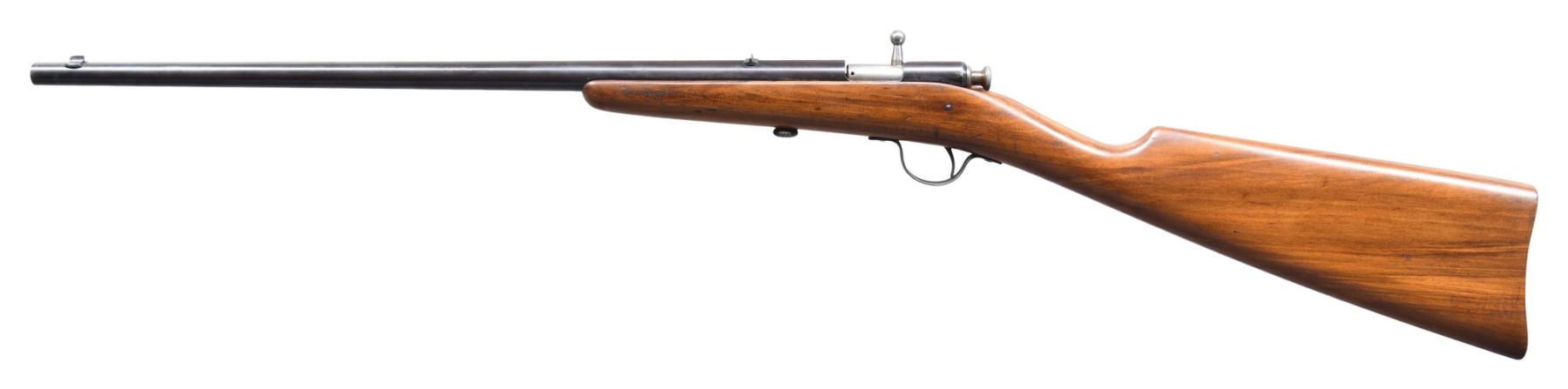 RIFLE. Cal. 22 S, L. NSN. Bbl. 18". Model 1900 single shot bolt action rifle mfg. by Winchester between 1899-1902. Top of the bbl. is marked with Winchester's mfg. and patent information, followed by the model and cal. designations. Metal components exhibit a blue finish overall, save for on the bolt assembly, which is polished in-the-white. Plain wood straight grip buttstock. Dovetailed blade front sight, with dovetailed V-notch rear sight. CONDITION: metal components retain the majority of their original factory blue finish, exhibiting some spots of light to mild wear and thinning, some scattered superficial handling marks, as well as some scattered spots of light surface oxidation overall. Bolt shows some spots of age related discoloration. Very bright bore, exhibiting scattered spots of dark pitting, while retaining strong rifling throughout. Stock shows scattered marks and minor impressions from handling and storage, but otherwise remains sturdy and serviceable. PROVENANCE: Estate of Russell Dickerman. (25-1810/MLW). CURIO. $200-300.