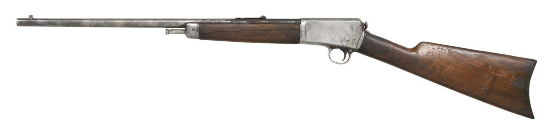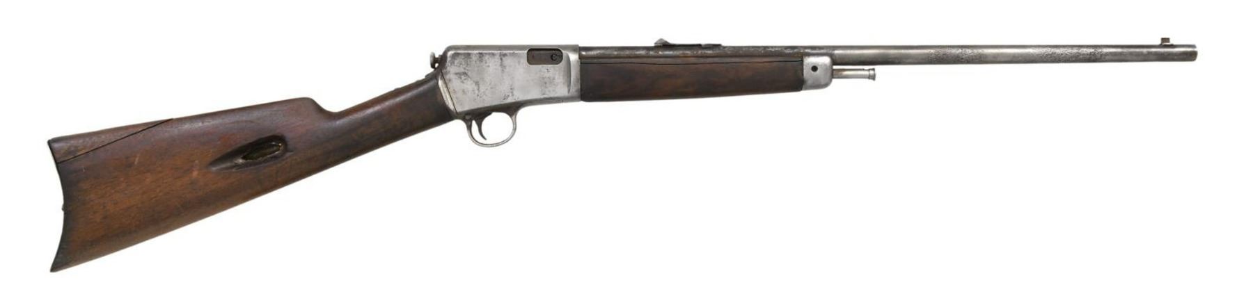 Cal. 22 Win. Auto. S# 31697. Bbl. 20". Open sights. Walnut stock set. CONDITION: poor overall with missing tube magazine. Metal has heavily cleaned, gray patina appearance. Wood has large cracks through forearm, and peek of buttstock held by wood dowel repair, but loose. Right side of buttstock has hobbiest contoured loading port, similar to Browning SA22 rifle, cutting into the stock, and opening to tubular magazine. Missing buttplate & forearm screws. Fair bore with pitting & noticeable lands. (23-4832/MD). CURIO. $75-150.