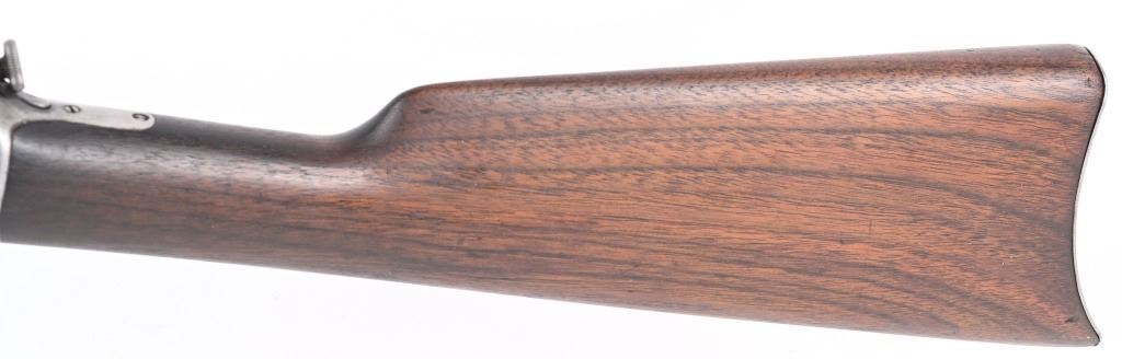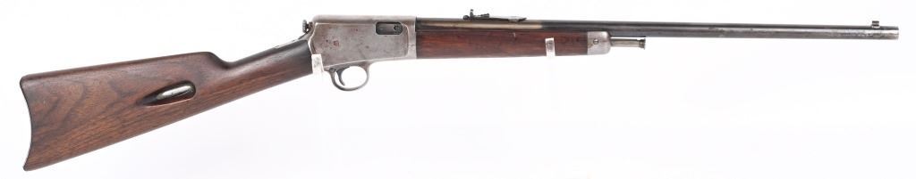 SERIAL NUMBER: 78964. BARREL: 20". CALIBER: .22 WIN AUTOMATIC. MANUFACTURED: 1912. Standard markings and features. Winchester proofs on the barrel and frame, in addition to a factory repair proof. Blade front sight and Marbles u-notch rear leaf. Original blued finish. Wood has been lightly sanded and refinished. Crescent metal butt plate. CONDITON: Metal is good overall with general wear and gray patina. The barrel has holes filled in on the left side. Wood has handling marks, scrapes and scratches. Bore is shiny with strong rifling. Mechanically good, but safety button is loose. C&R