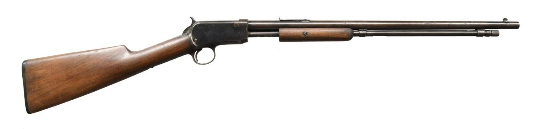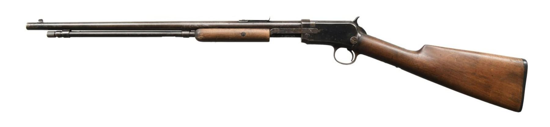 Cal. 22 S, L, LR. S# 305676. Bbl. 20". Model 1906 pump action rifle mfg. by Winchester in 1912. Left side of the round bbl. is marked with Winchester's 2 line address followed by the model designation, with the cal. designation stamped at the breech. Blued finish with plain smooth wood straight grip buttstock and smooth pump. Receiver has been reblued at one time. Blade front sight with V-notch rear sight. CONDITION: metal components exhibit wear and thinning through to gray patina, with areas of dark oxidation overall. Bore exhibits pitting and fair rifling throughout. Wood furniture shows scattered marks from handling and storage, but otherwise remains sturdy and serviceable. (23-4857/MLW). CURIO. $200-400.