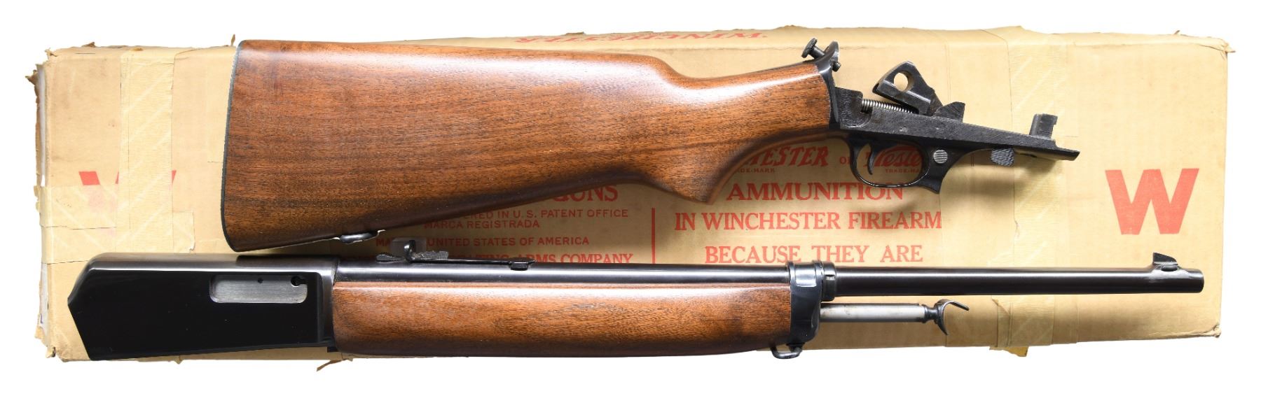 Cal. 351 Win Self-Loading. S# 55676. Bbl is 20" round with sporting sights. Action rod has finger curled actuation button. Blue finish. Semi-beavertail forearm and pistol grip walnut stock with checkered steel buttplate and sling swivels. Manufactured 1907-57. Magazine, 1 detachable 10 rd . UNATTACHED ACCESSORIES: proper style Winchester box without a label. Box contains instructions, safety brochure, hang tag, and older sales receipt. Box has one torn end flap. CONDITION: near new, appears unfired. Retaining 99% original finish. Bright, near excellent bore. (25-1470/DS). CURIO. $2,000-3,000.
