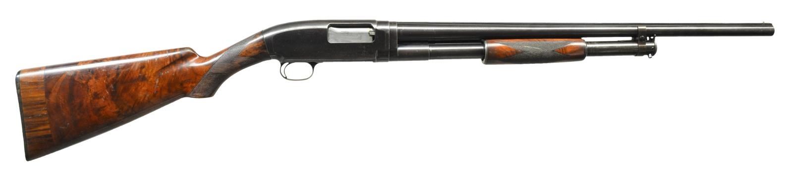 SHOTGUN. Cal. 16 Ga. S# 158168. Bbl. nickel steel w/ solid rib is shortened to 23 5/16" w/ cyl. bore. Steel bead. Original choke marking "FULL". Sm. rnd. forearm of fancy walnut w/ trap grade wrap around hand checkering. Early style pistol grip stock of fancy walnut w/ trap grade checkering. LOP: 14" over a Win. buttplate & 1 1/4" walnut spacer. 1917 Mfg. CONDITION: 70% dull reblued finish showing spots of freckling. Forearm has worn finish & checkering. Stock has touched up finish showing wear w/ numerous scratches & marks. Left side of stock near trigger guard has lg. area of epoxy repair. Bore shows some fouling. (21-2192/DS). MODERN. $350-500.