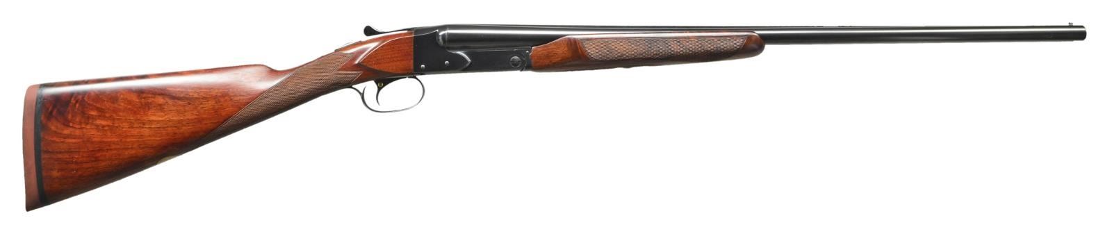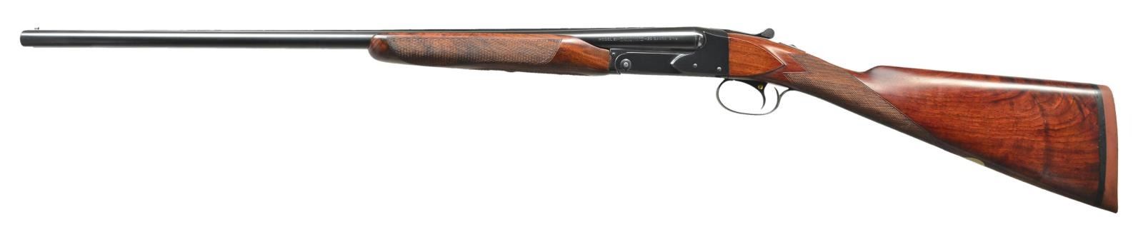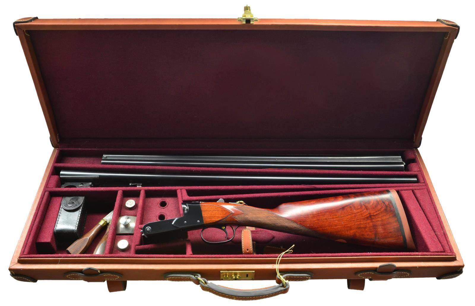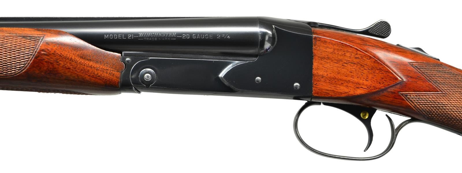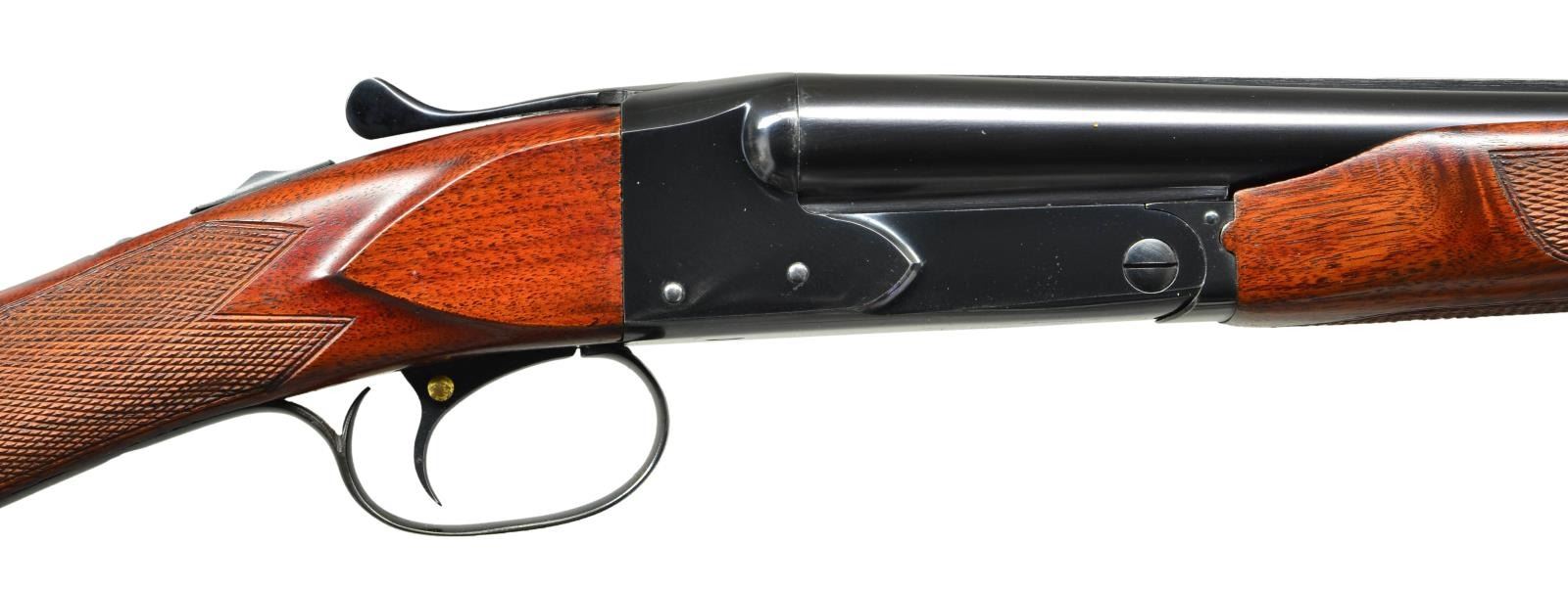 Cal. 20 ga. 2 3/4". S#. 17894. Bbls: (1) 26" with fixed WS-1 & WS-2 chokes. Target front sight with broken bead & steel mid bead.. (2) 30" with fixed Full & Full chokes. Steel front bead. Blue action has single selective trigger and ejectors. Beavertail forend with kidney pattern checkering. Straight grip checkered walnut stock has oval nameplate in toeline. LOP: 14 1/8" over an added solid red Winchester pad. DAC: 1 5/8". DAH: 2 5/8". Weight with 26" bbls. 6 lbs., 10 ozs. Cody firearms record check shows original stock configuration was pistol grip. Made for Union Hardware and Metal Company, order number 04/328-122A item 1. Inspection started on 11-8, 1949 and was completed 11-14, 1949. UNATTACHED ACCESORIES: Galazan leather covered 2 barrel set case with burgandy velour fitted interior and canvas cover. Case contains: snap caps, oil bottle, 2 piece hardwood cleaning rod, cleaning acc., turn screws, Galazan silicote cloth and unattached paper Winchester case label. CONDITION: Action has 98% properly reblued finish showing a small amount of edge wear with light scratches on the floorplate. Both set of bbls. retain over 98% blue and have very good bright bores. Stock & forend have a reddish toned refinish with freshened checkering. (22-5823/DS). CURIO. $5,500-8,500.