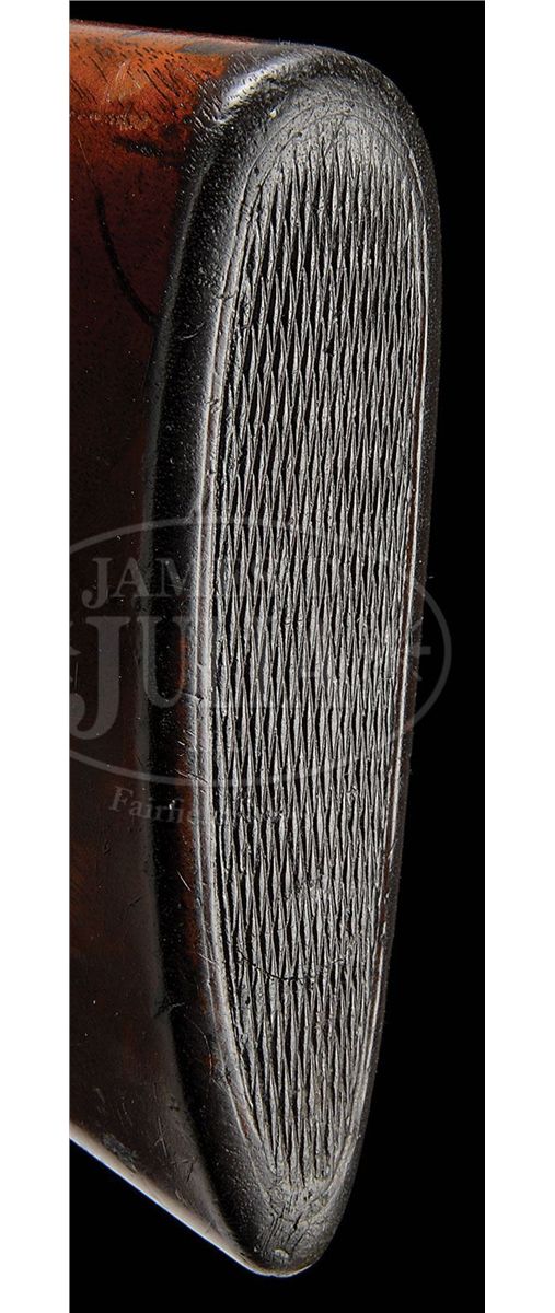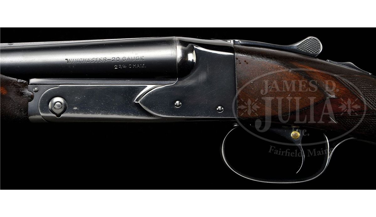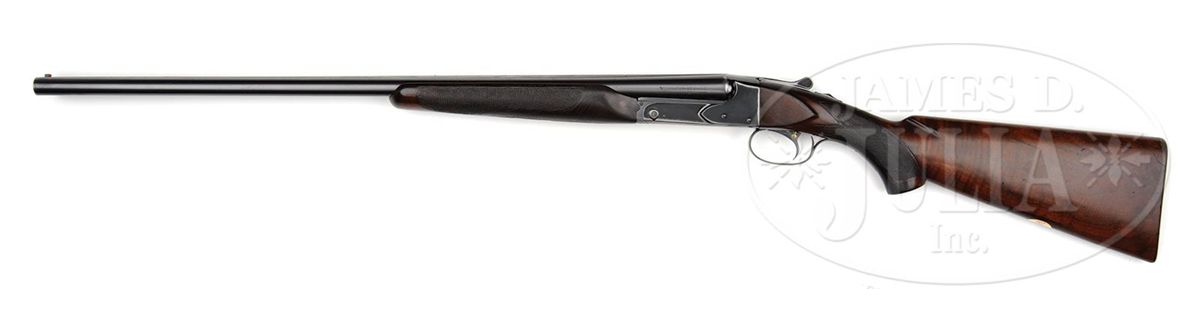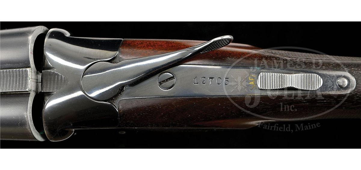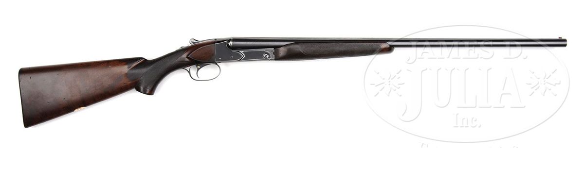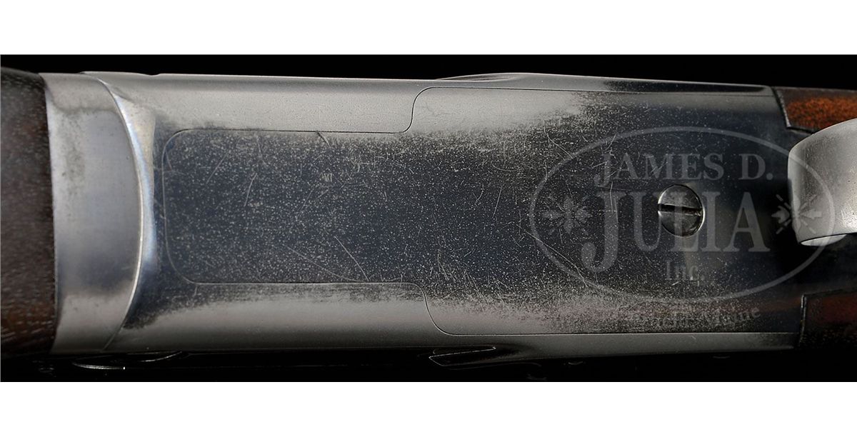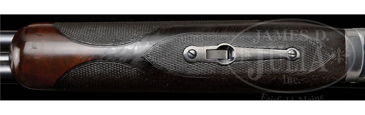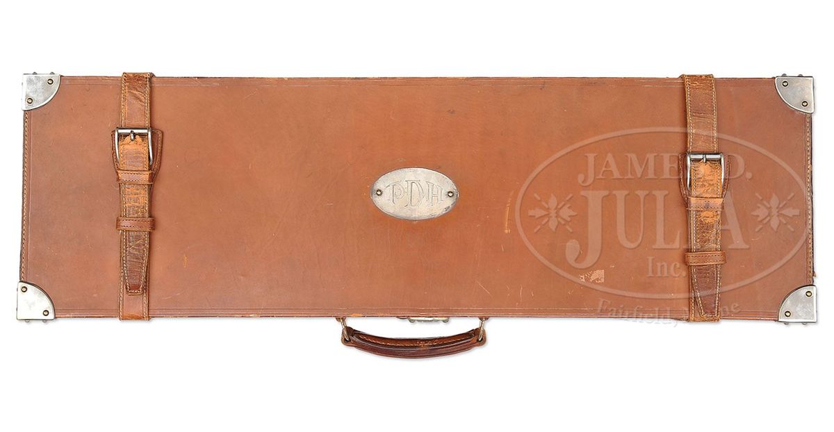 SN 12705. Cal. 20 ga. 2-3/4" Chambers. 26" Bbls, choked Skeet 1 and 2, with matted rib mounted with silver mid, and Bradley red front, beads, are marked "WINCHESTER - 20 GAUGE" and "2-3/4 CHAM." on side of left bbl. Bbl flats and bottoms of bbls have all correct marks. Standard blued action is fitted with non-automatic safety and blued single selective trigger. Lightly figured American walnut square pistol grip buttstock measures 14" over checkered wood butt. Standard checkering is at grip, and a gold oval engraved "P. H." is on toe line. Matching beavertail ejector forend is unbraced. Bore diameter: left-.612, right -.611. Bore restrictions: left -.004 (Skeet), right -.004 (Skeet). Wall thickness: left -.030, right -.025. Drop at heel: 2-7/16", drop at comb: 1-9/16". Weight: 6 lbs. 11 oz. LOP: 14". Period leather case with nickel-plated brass riveted-on corners, has oval plated medallion on top, engraved "P D H". Interior is lined in green felt, with covered compartments and movable bbl blocks. Case holds a pair of birch handled turnscrews. PROVENANCE: Cover letter from consignor stating that this gun belonged to his father-in-law, Pierre D. Houdry, who father Eugene Houdry invented the first commercially viable process of catalytic cracking of gasoline, resulting in high octane aviation fuel during WWII, still used in refineries today. He was also instrumental in the development of synthetic rubber and was granted a patent in 1956 for the catalytic converter(Wikipedia). CONDITION: Very good. Bbls retain most of an old re-blue, with some light freckling and scratches. Action retains about 60% of a shiny re-blue, silvering on bottom, fences, and tang. Buttstock retains most of its orig finish with a number of light and deeper marks, turning dark where worn through at grip, on comb, and sharp edges of side panels. Checkering is worn. Forend is in like condition, but with only front portion still light in color. Bores are excellent. Action is tight. Ejectors are in time. Trigger works. Case is very fine. Leather is beginning to darken, and has some scuffs. Plating on hardware is beginning to brass. Straps and handle are good. Interior cloth is fine, with some slight insect damage and marks, as well as evidence of an old label being removed. Turnscrews are fine. 4-49231 MGM269