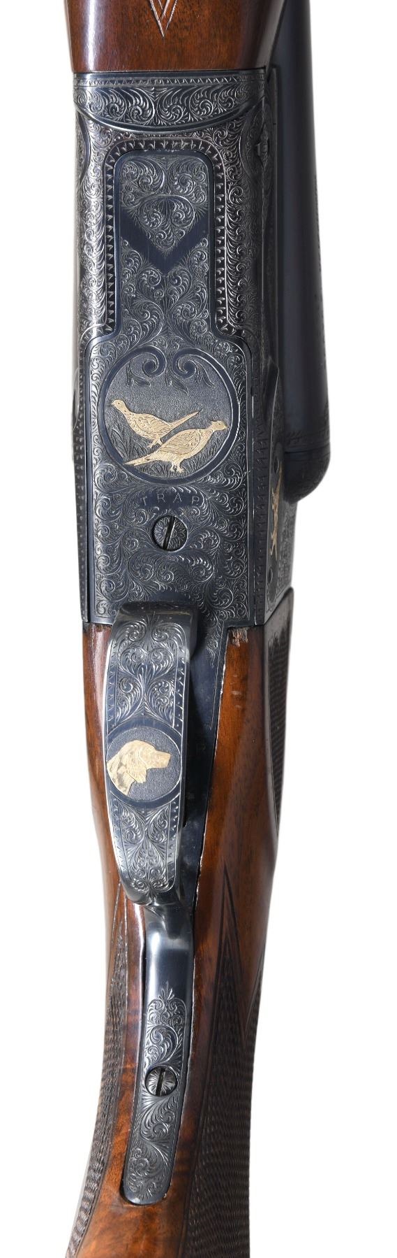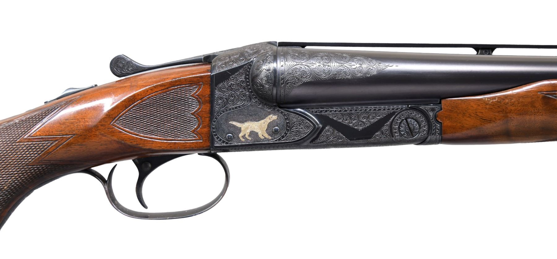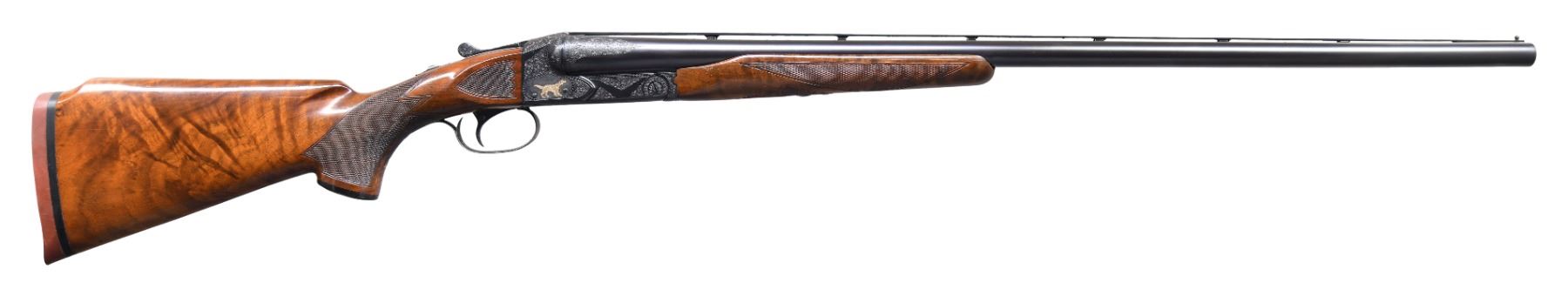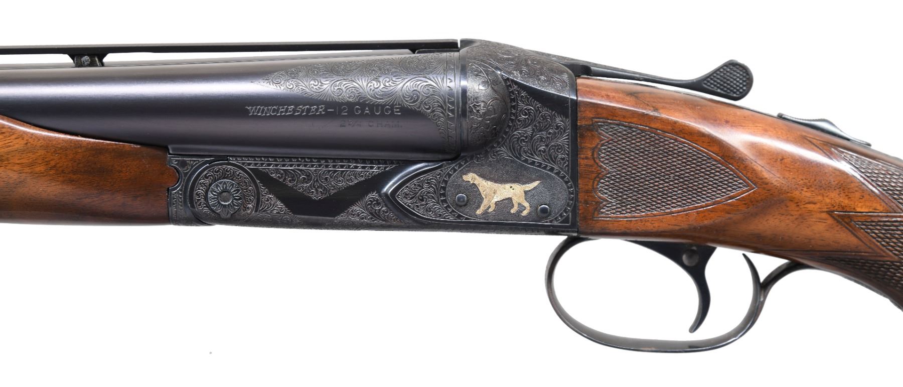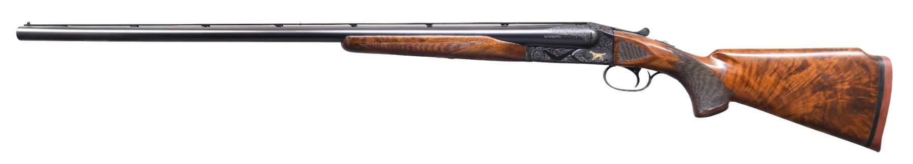 SXS SHOTGUN. Cal. 12ga 2 3/4". S# 23183. Bbls are 30" vent rib w/ fixed IMP MOD and FULL chokes. Blued boxlock action has custom aftermarket Style 6 hand engraving. Engraving features scenes w/ gold pointing dogs on both sides, two gold pheasants on floorplate and gold dog portrait on trigger guard. Balance of action, forearm and breech end of bbls have vine type foliate scroll w/ fancy borders. Features include SST, selective ejectors and non-automatic safety. Original beavertail forearm w/ point pattern checkering. Custom Monte Carlo stock of fancy walnut w/ Bishop plastic grip cap. Wrist of stock has point pattern hand checkering w/ additional checkering on stock ears. LOP: 13 3/4" over reproduction solid red Winchester pad. DAC: 1 1/2". DAMC: 1 3/8". DAH: 1 7/8". Stock has approx 1/4" cast on. WEIGHT: 8lbs. CONDITION: bbl and action retain over 97% reblued finish. Forearm has lightly worn original finish and checkering showing handling marks and light dents. Stock has good finish and checkering showing a few small marks. Action is tight w/ top lever sitting nicely right of center. Bbl selector on trigger will not shift to left bbl. Rear vent rib post has replacement pin. Very good bright bores. (25-1396/DS). CURIO. $3,000-4,500.