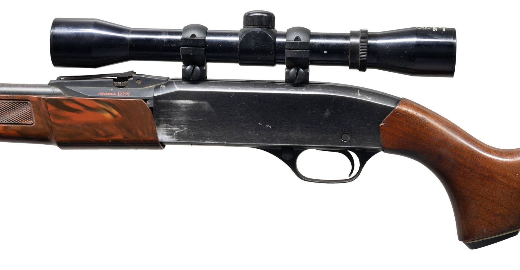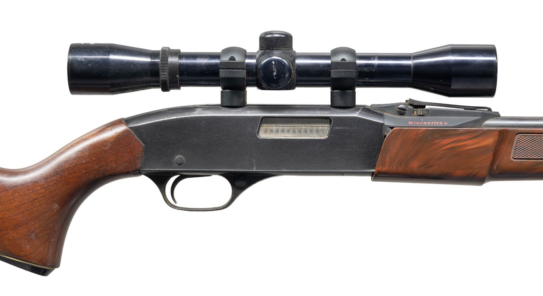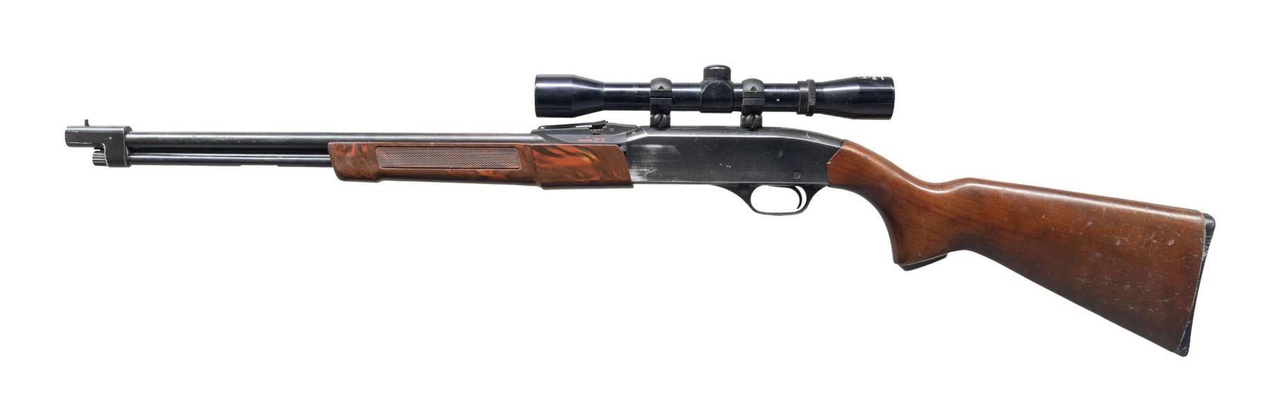 Cal. 22 S, L, LR. NSN. Bbl. 20 1/4". Model 270 slide action rifle mfg. by Winchester. Left side of the bbl. is marked with the Winchester trademark logo and cal. designation. Left side of rear sight assembly is marked "MODEL" followed by a boxed "270". Alloy receiver, steel bbl., and steel mag. tube exhibit a blue finish. Alloy front sight block and trigger housing exhibit a black enamel type finish. Checkered mottled brown synthetic pump and plain wood pistol grip stock with grooved black synthetic Winchester buttplate. Grooved receiver is fitted with a Simmons Model #1006 4x32 scope. CONDITION: metal components retain good amounts of their original factory finish, showing areas of wear and thinning fading to gray patina and scattered superficial handling marks overall. Bbl. shows scattered spots of mild pitting and dark surface oxidation. Very bright bore, retaining strong rifling throughout. Proper manual mechanics. Synthetic forearm shows scattered scratches and superficial marks. Buttstock exhibits scattered scratches, marks, and impressions, with scattered mildew spots. (25-4800/MLW). CURIO. $100-300.