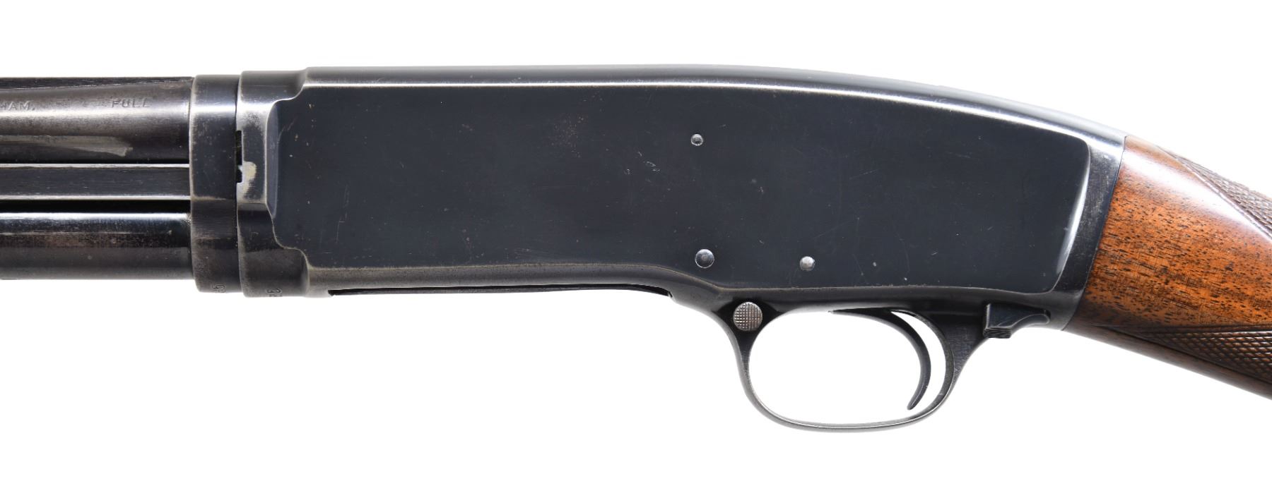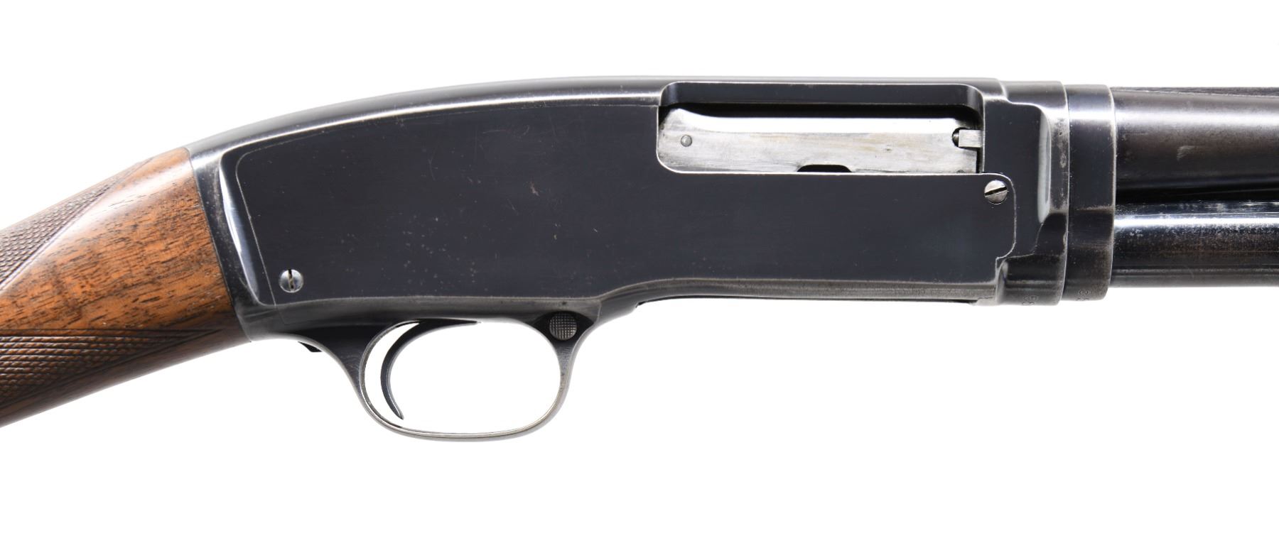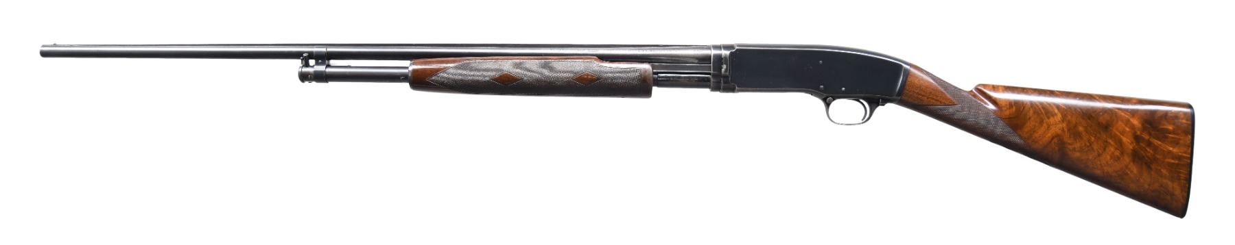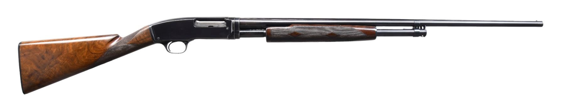 SHOTGUN. Cal. 410 3". S# 55085. Bbl. 28" solid rib w/ fixed full choke & steel bead. Beavertail forearm & straight grip stock of fancy walnut have double diamond deluxe factory checkering. LOP: 13 5/8" over Winchester buttplate. Mfg. 1947. CONDITION: 75% blue showing slide & carry wear. Original wood finish shows wear w/ scratches, marks & small dents. Left side of stock has an open grain check between checkering & comb. Very good bore. PROVENANCE: The estate collection of Don "Duck" Combs. (24-2490/DS). CURIO. $4,000-6,000.