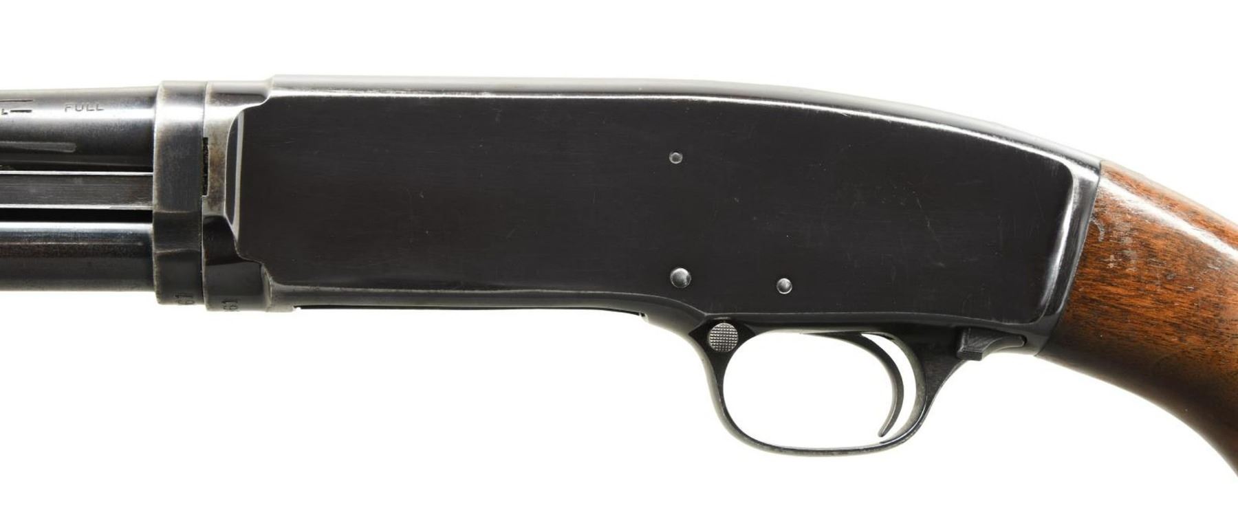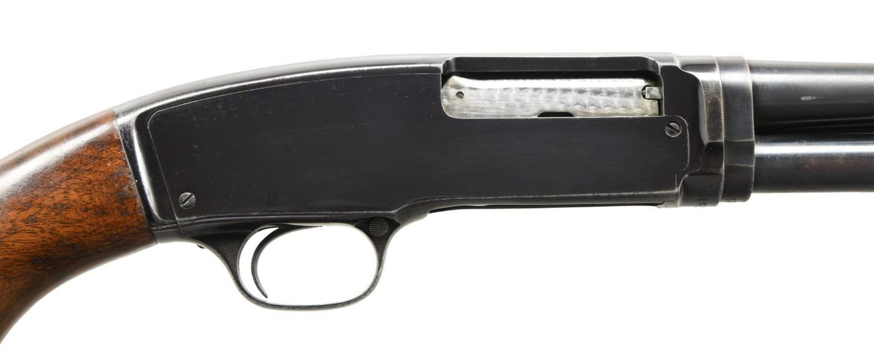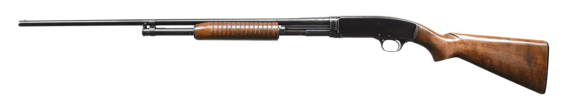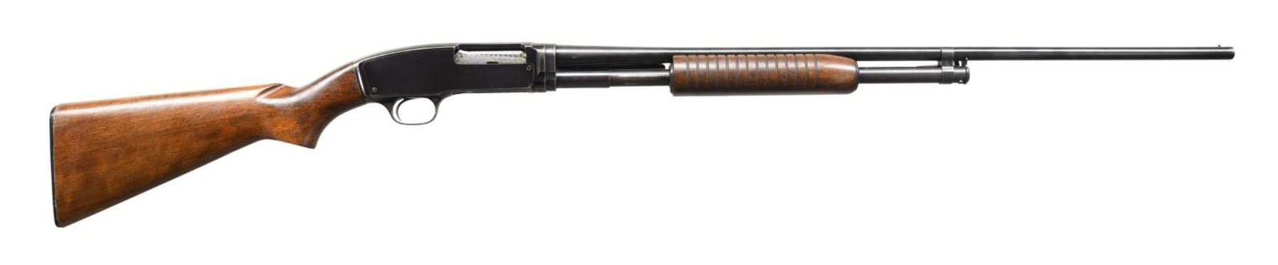 Cal. 410, 3". S# 142961. Bbl. 28 1/4". Model 42 pump action shotgun mfg. by Winchester in 1960. The left side of the bbl. is marked with Winchester's trademark logo, followed by stampings stipulating the model and cal. designations, as well as Winchester's mfg. information. Metal components exhibit a blued finish. Smooth plain wood pistol grip buttstock with grooved wood pump. CONDITION: metal components retain large amounts of their original factory blue finish, exhibiting areas of mild to moderate wear overall and some areas of surface oxidation. Mirror bore. Wood furniture shows some scattered marks and dings from handling and storage, but otherwise remain sturdy and serviceable. PROVENANCE: The Collection of Gun Sport Ltd owned by Jon R. Thomas. (23-3816/MLW). CURIO. $800-1,200.