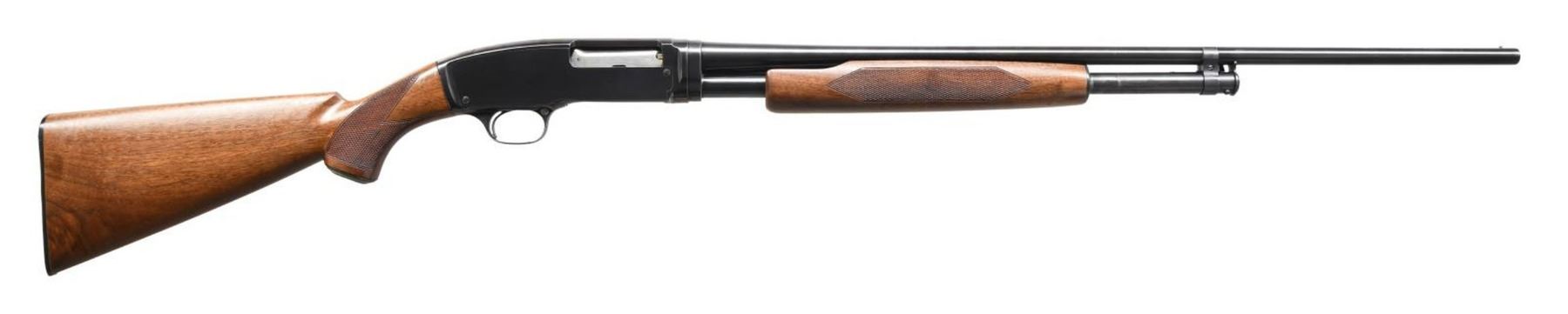 Cal. 410, 3". S# 119161 (1955). The plain Winchester proof steel 26" bbl. has bright front bead & marked "MOD" for choke. Blue finished. Replacement walnut stock set w/ checkering, Winchester grip cap & Winchester buttplate. LOP: 14 1/2". CONDITION: very good blue w/ light wear from cycling & edge wear on receiver. Very good wood finish w/ uneven fit to action. Very good shiny bore w/ light fouling. (23-5147/MD). CURIO. $800-1,200.