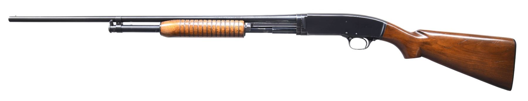 Cal. 410 3". S# 68109. Bbl is 26" plain with fixed full choke and steel bead. Flat bottom grooved forearm and pistol grip walnut stock with original buttplate. Manufactured in 1948. CONDITION: over 95% blue showing slide and carry wear. Original wood finish shows light wear with scattered small marks. Very good bore. (25-1524/DS). CURIO. $1,500-2,000.