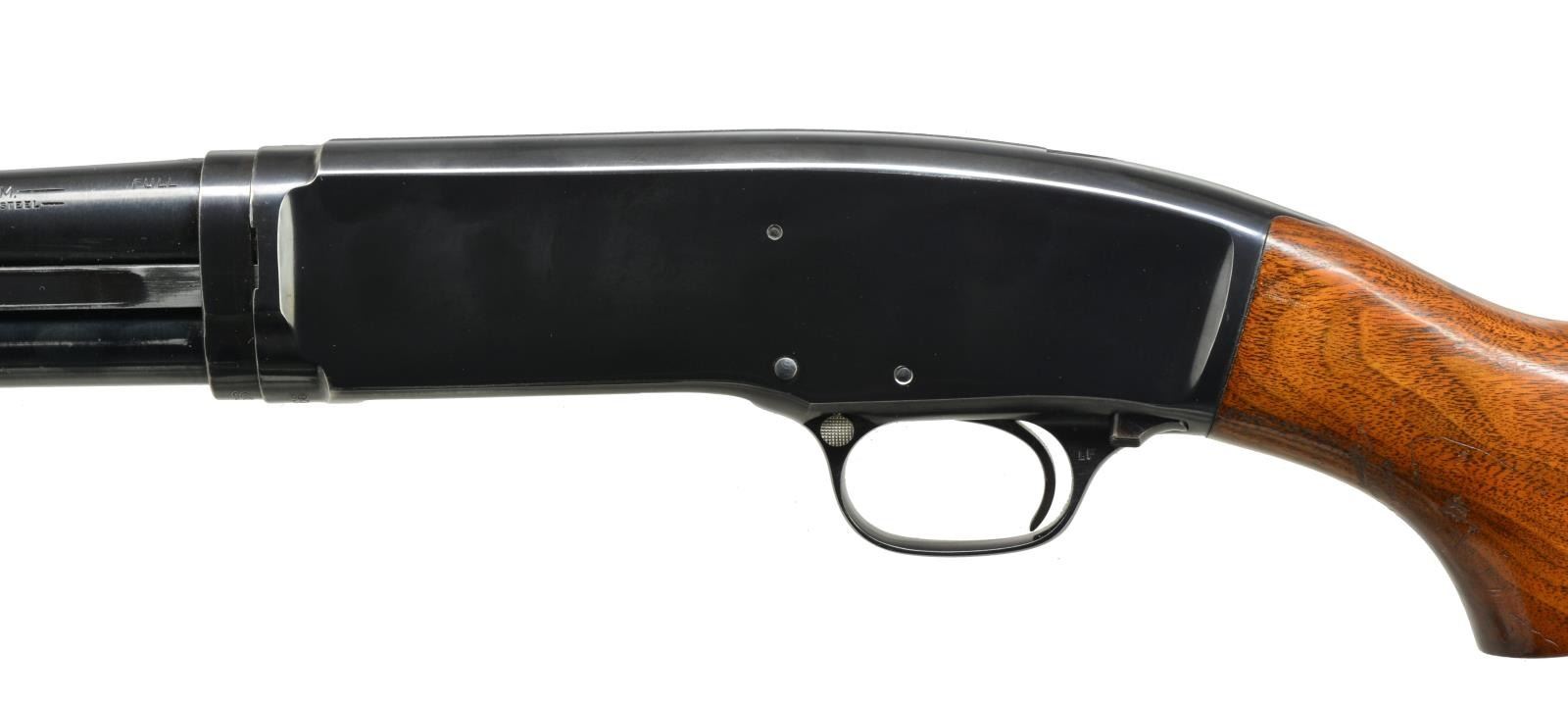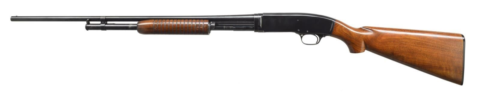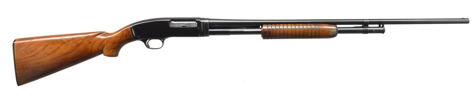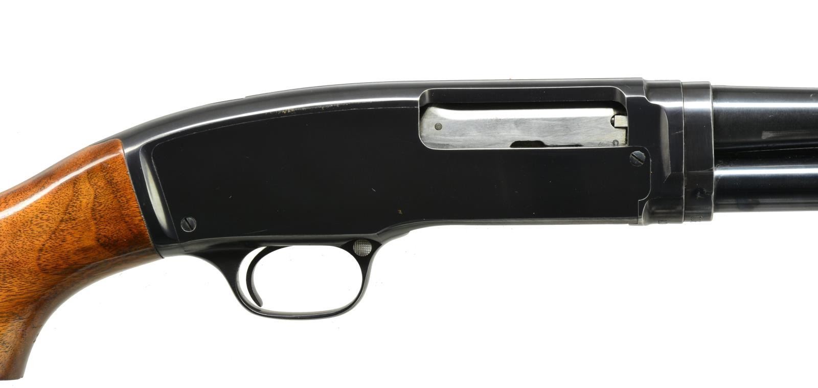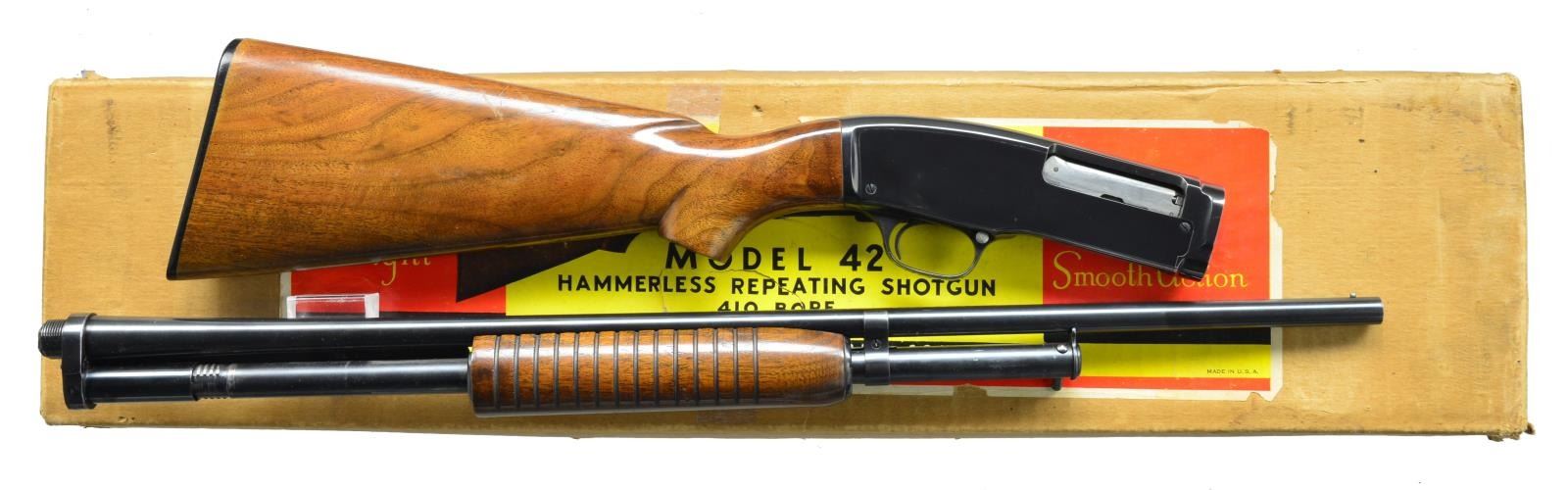 Cal. 410. S# 106866. Bbl. 26" full choke w/ 3" chambers. Single bead front sight. 14 Ring flat bottom forend. Uncheckered pistol grip w/ Winchester hard rubber buttplate. UNATTACHED ACCESSORIES: original serial numbered box. Box contains original paperwork & hanging tags, as well as wooden mag. plug. CONDITION: bbl. retains very good original blue w/ a couple minor spots of discoloration. Minor muzzle wear. Minor rub mark at chambers from forend. Receiver has very good, original blue w/ minor wear on sharp edges. Forend has original finish w/ minor scratch on bottom. Stock has original finish w/ minor handling marks. Bore is bright. (20-3089/BT). MODERN. $1,500-2,000.