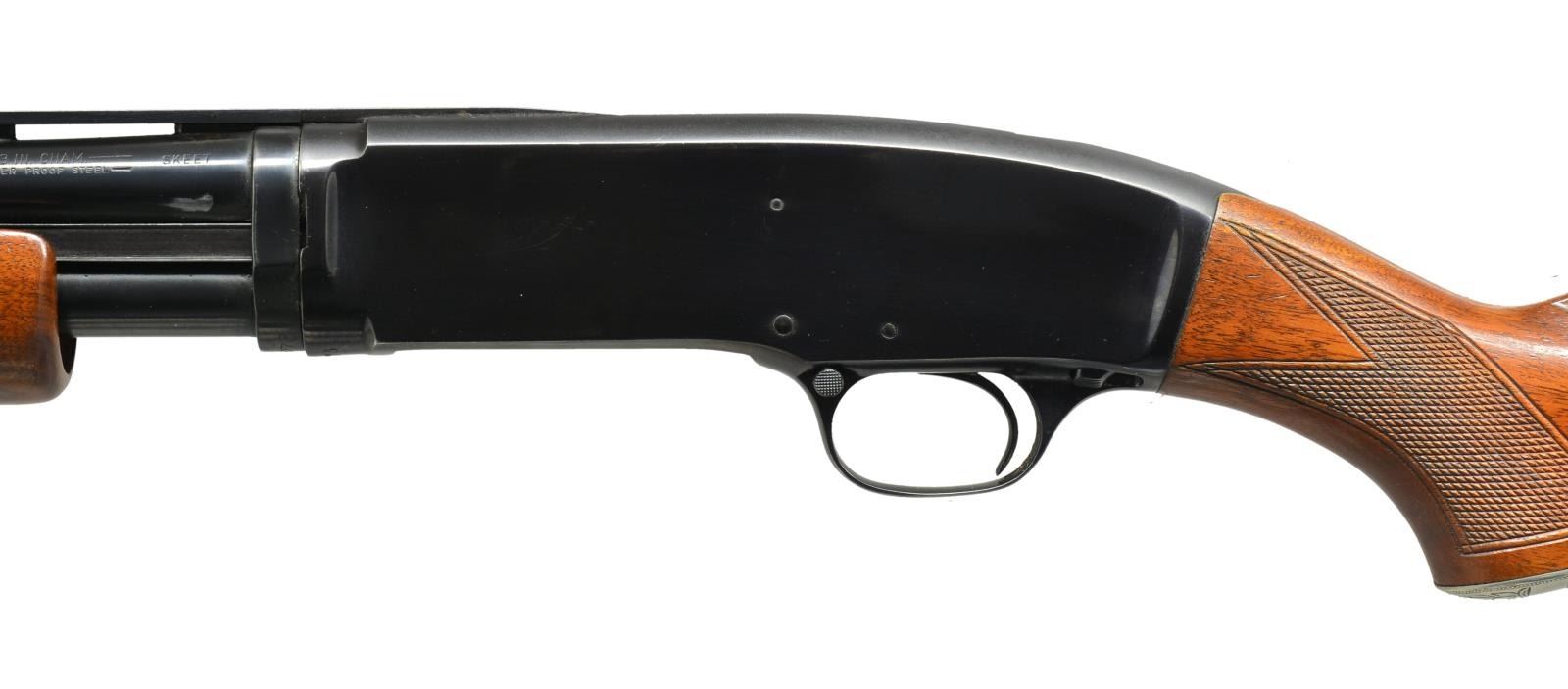 Cal. 410, 3". S# 163273. Bbl. 26 1/4" over ventilated Cutt's Compensator w/ Spreader tube. Lg. oval post aftermarket Simmons VR. Steel front bead w/ broken mid bead. Original choke marking is Skeet. Aftermarket beavertail walnut forearm w/ diamond pattern hand checkering. Original pistol walnut Skeet stock w/ hand checkering & engraved German silver grip cap. LOP: 14" over red ventilated White Line pad & spacers. CONDITION: 90% blue showing slide wear. Wood has moderately worn finish showing scattered handling marks. Nice bright bore. (21-342/DS). CURIO. $1,000-1,500.