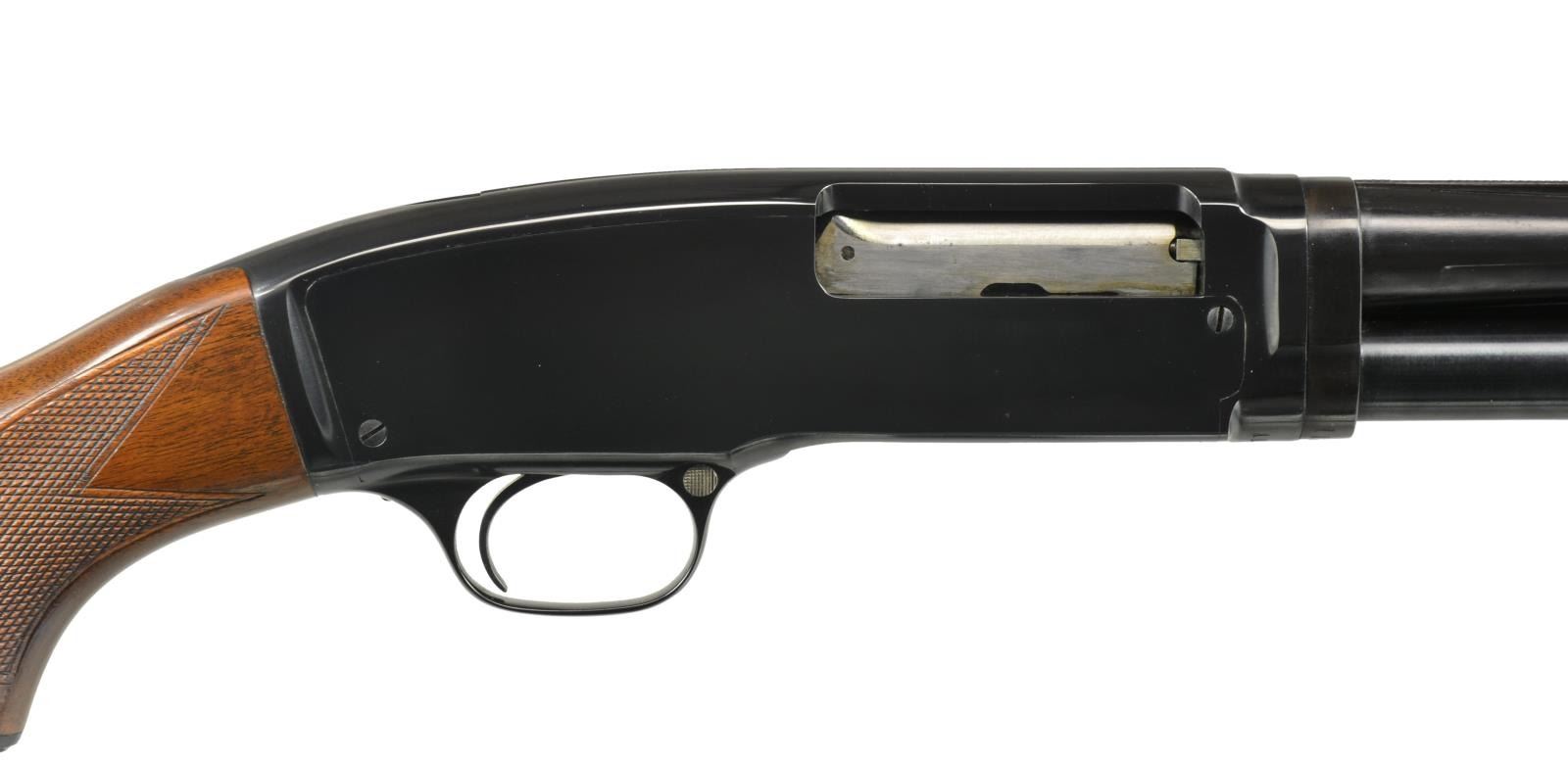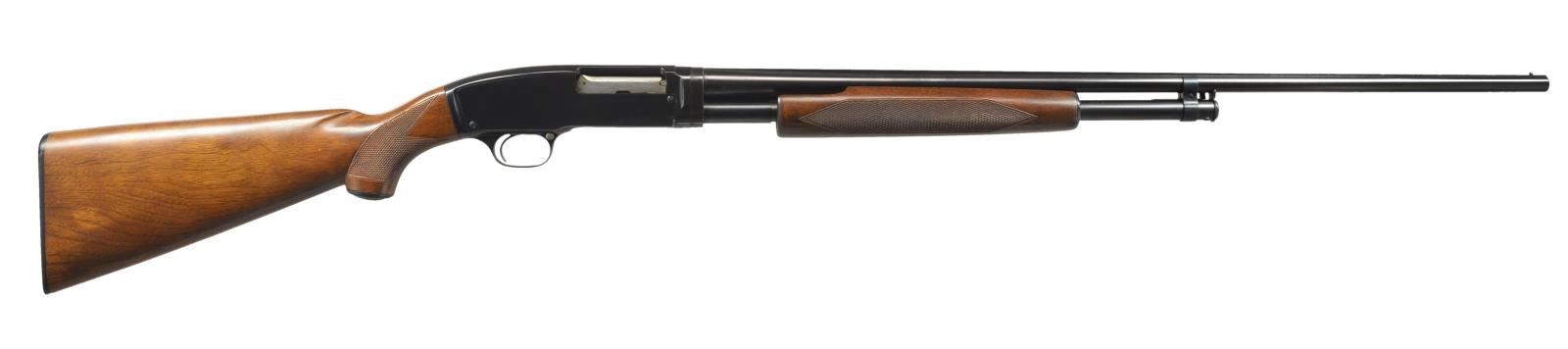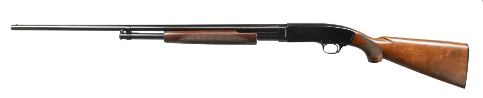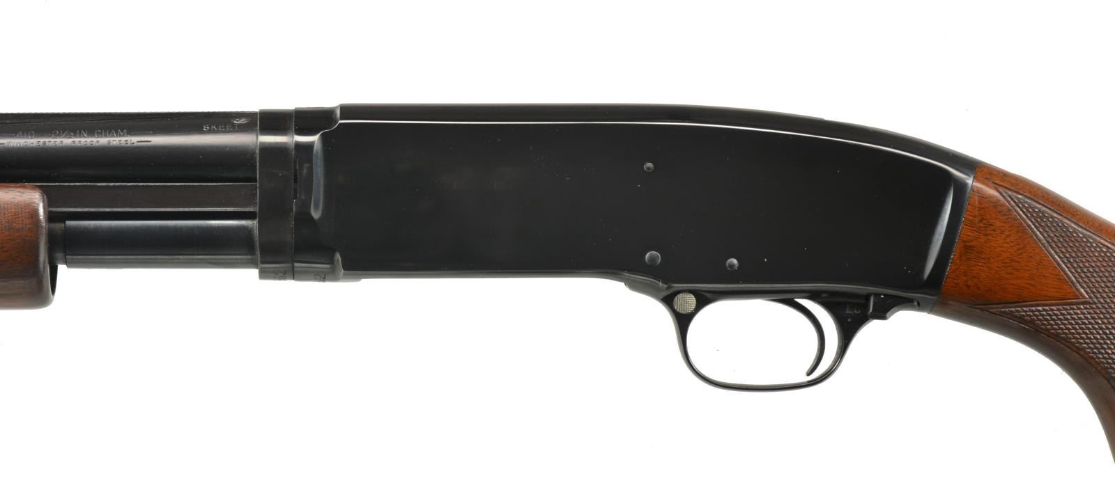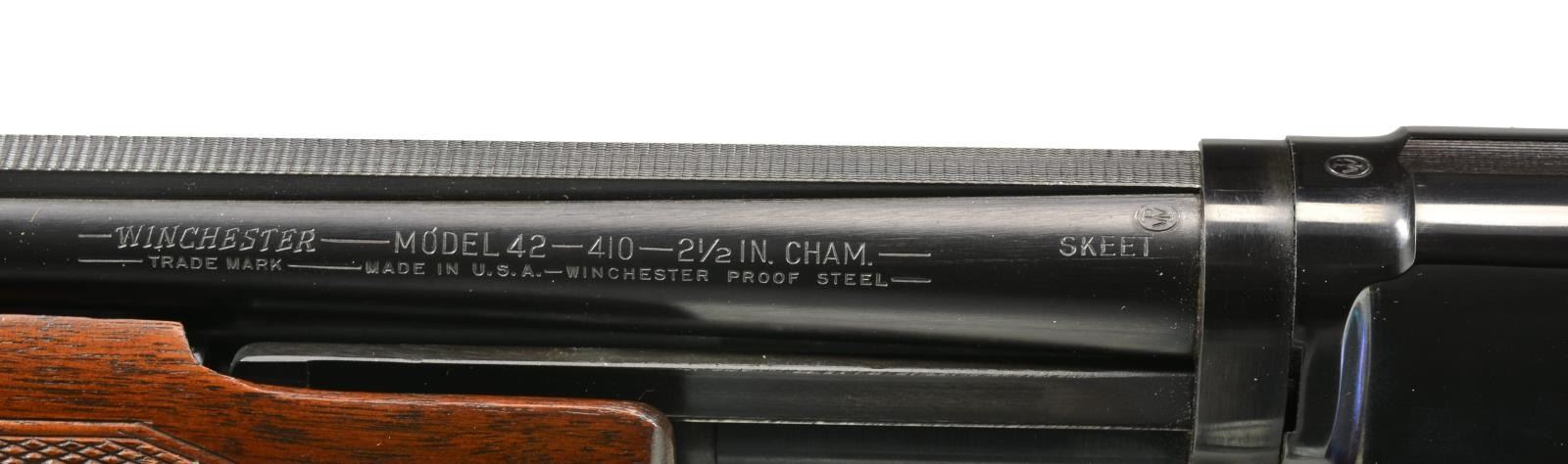 PUMP SHOTGUN. Cal. 410, 2 1/2". S# 111862. Bbl. 28". Skeet style checkered forend w/ panels on either side. Checkered pistol grip stock w/ Winchester hard rubber buttplate. Single silver front bead. CONDITION: bbl. & mag. tube retain very good original blue w/ sharp edge wear on slide bar. Receiver has very good original blue w/ slight high edge wear. Forend has original finish , checkering is good w/ a couple minor marks. Stock has original finish w/ good checkering & just a couple minor handling marks. Bright shiny bore. (20-1736/BT). CURIO. $7,000-10,000.