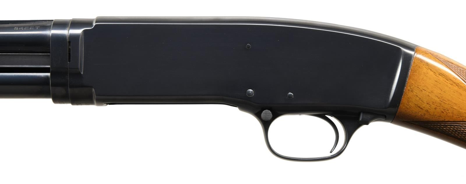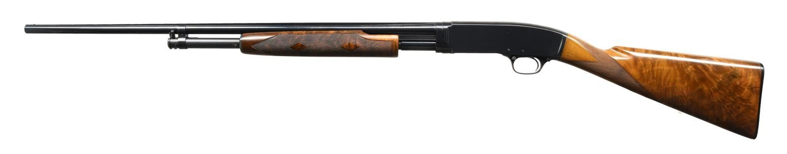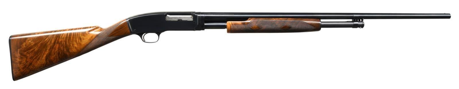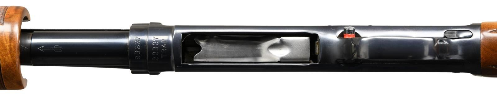 Cal. 410. 3". S# 23337. Bbl. 26" w/ solid rib. White front & mid bead. Bottom of receiver below S# is marked "TRAP". Beavertail forend & straight grip stock of fancy walnut w/ double diamond deluxe hand checkering & original buttplate. Mfg. 1936. CONDITION: metal retains over 98% reblued finish. Stock has very good gloss refinish. Very good bright bore. (23-4863/DS). CURIO. $5000-8000.