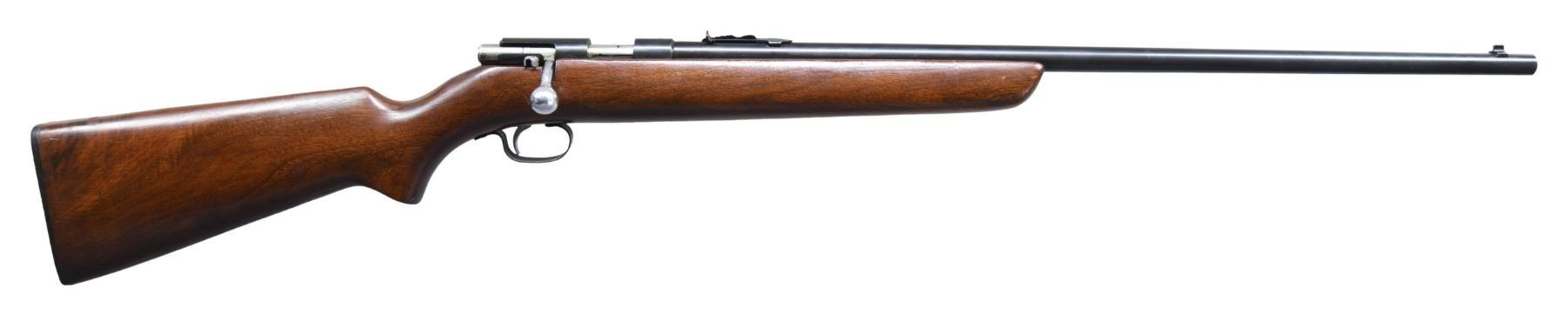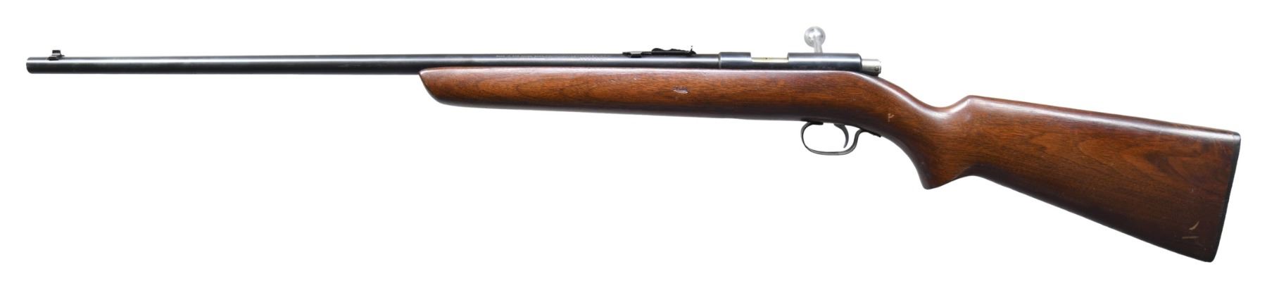 Cal. 22 S, L, LR. NSN. Bbl. 25 1/4". Model 47 single shot bolt action rifle mfg. by Winchester from 1949-1954. The left side of the bbl. is marked with Winchester's mfg. information, followed by the Winchester trademark logo, as well as the model and cal. designations. Metal components exhibit a blue finish overall, save for on the bolt assembly, which is polished in-the-white. Bolt knob exhibits a nickel plated finish. 1-piece plain wood pistol grip buttstock. Dovetailed blade front sight, with dovetailed U-notch rear sight. CONDITION: metal components retain the majority of their original factory blue finish, exhibiting a few scattered spots of light to mild wear, some scattered superficial handling marks, as well as some scattered spots of light surface oxidation overall. Bolt is very good overall. Mirror bore, retaining well defined rifling throughout. Stock shows some scattered superficial marks and minor impressions from handling and storage, with a small gouge present on the left side. PROVENANCE: Estate of Russell Dickerman. (25-1774/MLW). CURIO. $300-400.