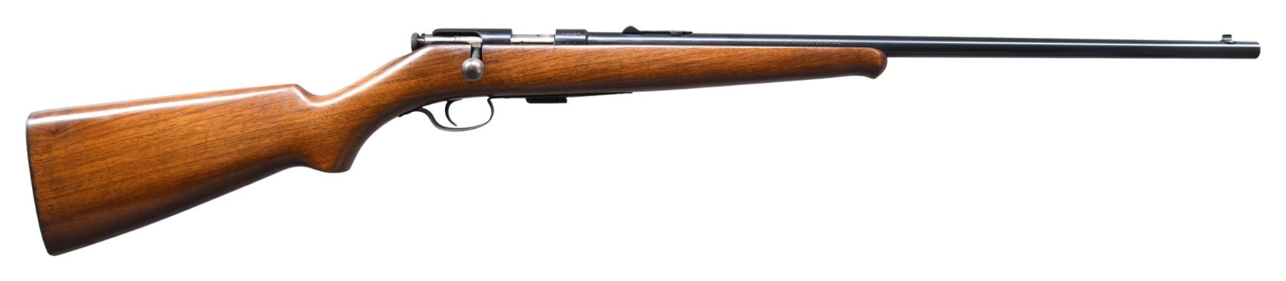 Cal. 22 LR. S# 15027. Bbl. 22". Model 56 bolt action rifle mfg. by Winchester in 1929. The left side of the bbl. is marked with the model designation, followed by the Winchester trademark logo, as well as the cal. designation, with Winchester's mfg. and patent information marked on the right. Metal components exhibit a blue finish overall, save for on the bolt body, which is polished in-the-white. 1-piece plain pistol grip buttstock, with schnabel tip forearm and flat checkered steel buttplate. Dovetailed aluminum beaded blade front sight, with dovetailed U-notch rear sight. MAGS: 1 5-rd. CONDITION: very good, with metal components retaining bountiful amounts of their original factory blue finish, exhibiting a few scattered spots of light surface oxidation overall. Bolt knob shows wear and thinning through to a gray patina. Mirror bore, exhibiting well defined rifling throughout. Stock shows some scattered superficial marks from handling and storage, as well as some losses to the varnish on the left side of the butt, but otherwise remains sturdy and serviceable. PROVENANCE: Estate of Russell Dickerman. (25-1796/MLW). CURIO. $300-400.