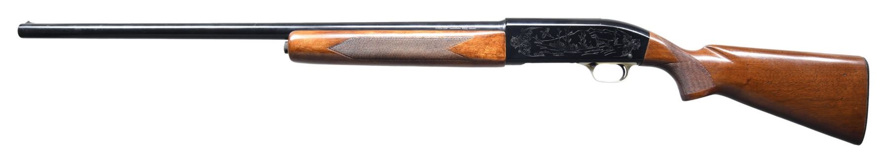 SHOTGUN. Cal. 12 GA, 2 3/4". S#12756. Bbl. 28". Model 59 semi-automatic shotgun mfg. by Winchester between 1960-1965. Left side of the bbl. is marked "WIN-LITE", followed by "12 GA. - 2 3/4 CHAM." above "FULL". Left side of the receiver is engraved with a scene of a hunting dog and a pheasant, with the right side exhibiting a scene of 3 duck. Right side of the receiver is marked with the Winchester trademark logo above the model and cal. designations. Aluminum receiver exhibits a black anodized finish, with the aluminum trigger guard being in-the-white. Steel bbl. features a black fiber glass wrapping. Checkered wood pistol grip buttstock and forend appear to have been lightly sanded and revarnished, with the checkering appearing to have been recut. Aluminum bead front sight. CONDITION: metal components retain the majority of their original factory finishes, exhibiting some scattered superficial handling marks overall. Mirror bore, exhibiting some areas of mild surface oxidation. Wood furniture shows some scattered marks and impressions from handling and storage, with a small chip present on the toe of the buttstock. PROVENANCE: Estate of Russell Dickerman. (25-1920/MLW). CURIO. $300-500.