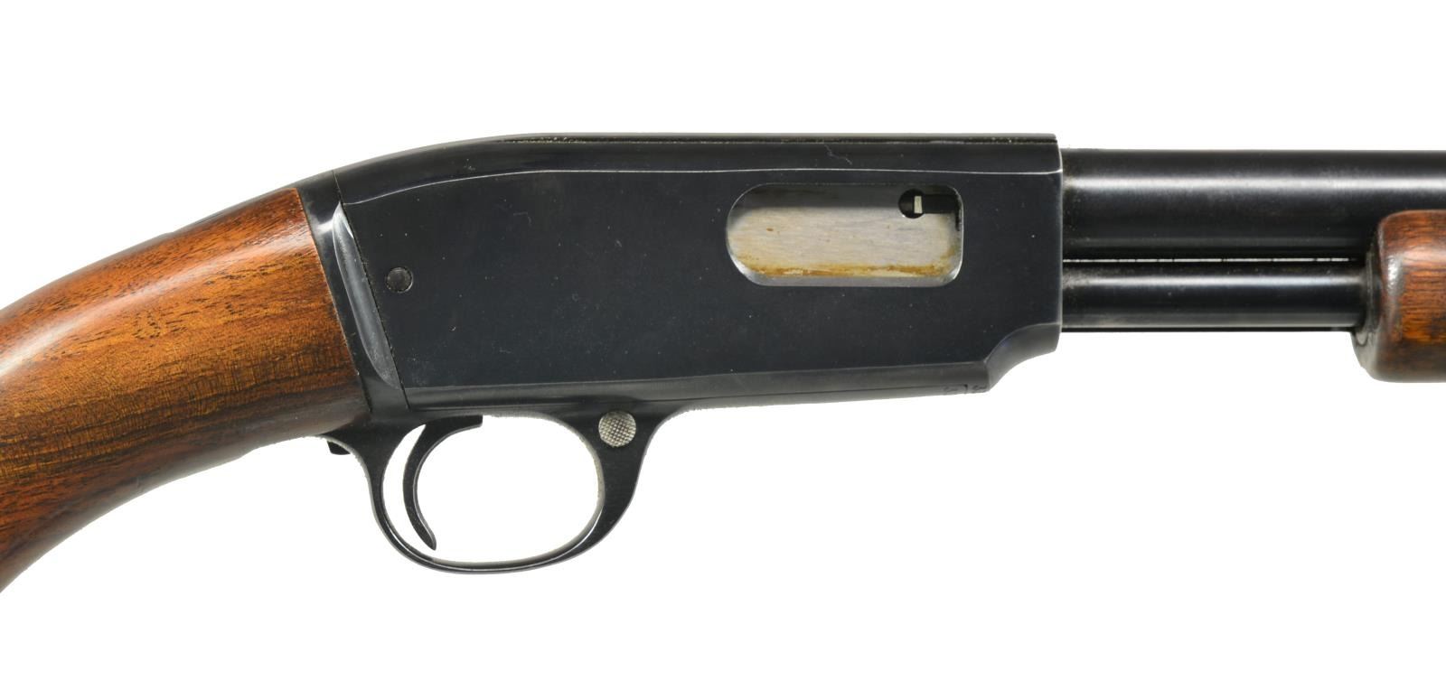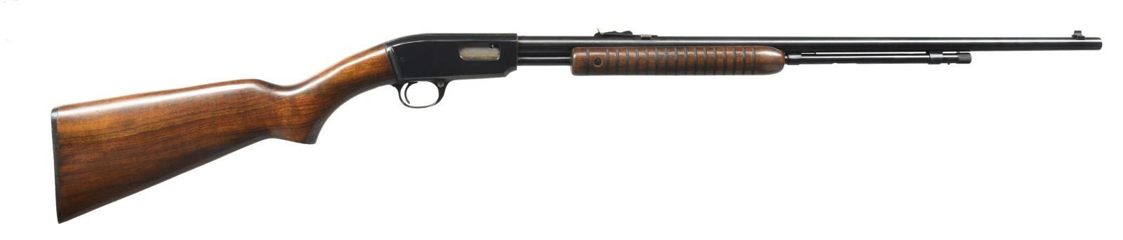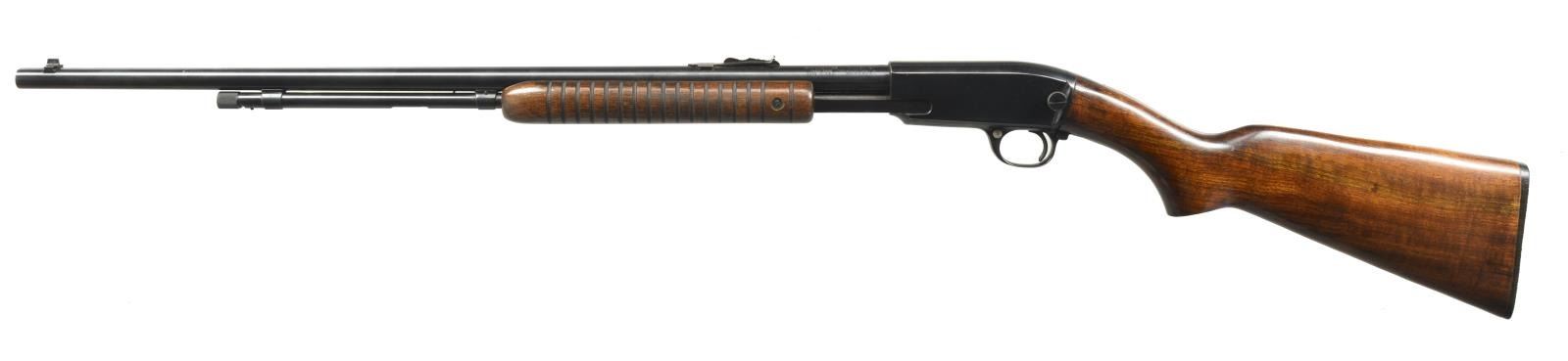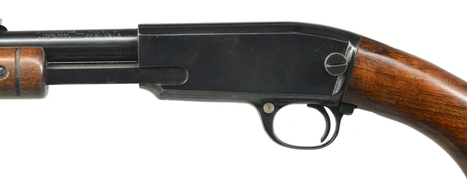 ACTION RIFLE. Cal. 22 S, L, LR. S# 339987. Bbl. 24". Dovetail front bead sight. Dovetail adj. rear sight. 17 Ring flat bottom forend. Uncheckered pistol grip stock w/ Winchester hard rubber buttplate. CONDITION: bbl. retains most of its original blue w/ minor wear at chamber area & a couple spots of faint surface oxidation. Receiver has original blue w/ minor wear on sharp edges. Slide bar has wear on sharp edge. Forend has original finish w/ minor handling marks. Buttstock has cleaned original finish w/ a couple minor knicks & scratches. Bore is good. (20-1724/BT). CURIO. $700-1,000.